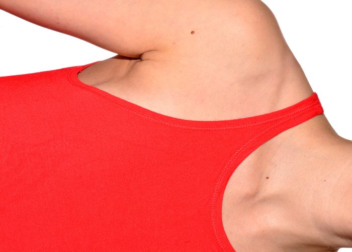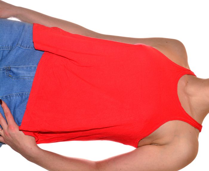 débardeur rouge uni décontracté fuide col rond taille S décolleté sur les côtés de la poitrine aisselle à aisselle élastiqué au maximum 50 cm longueur 51 cm