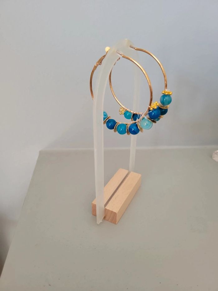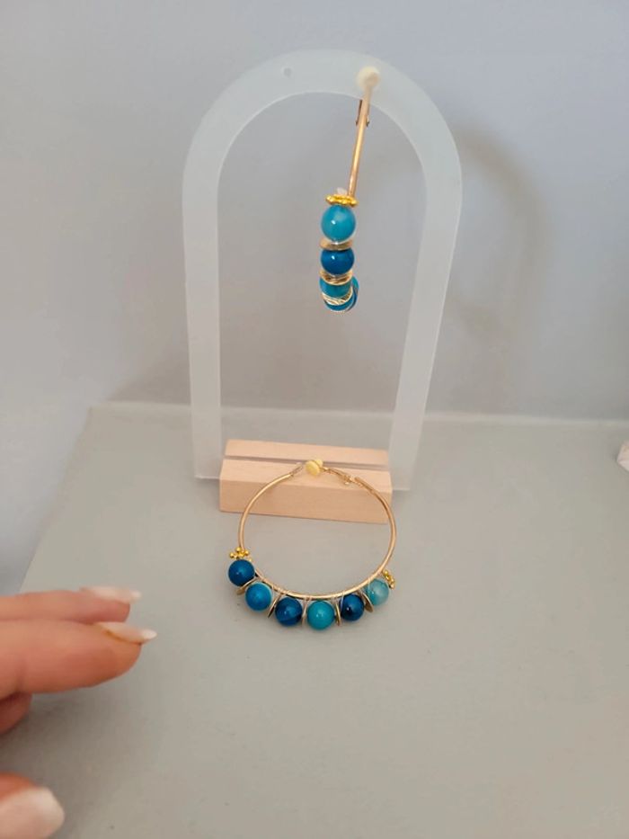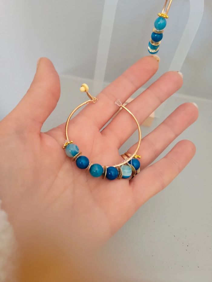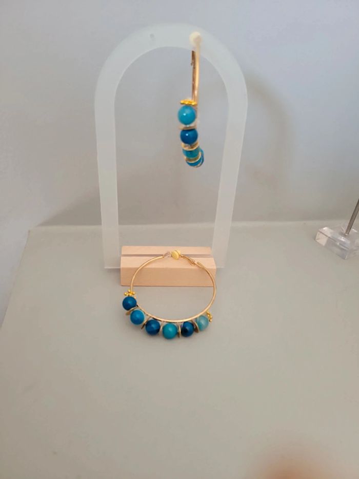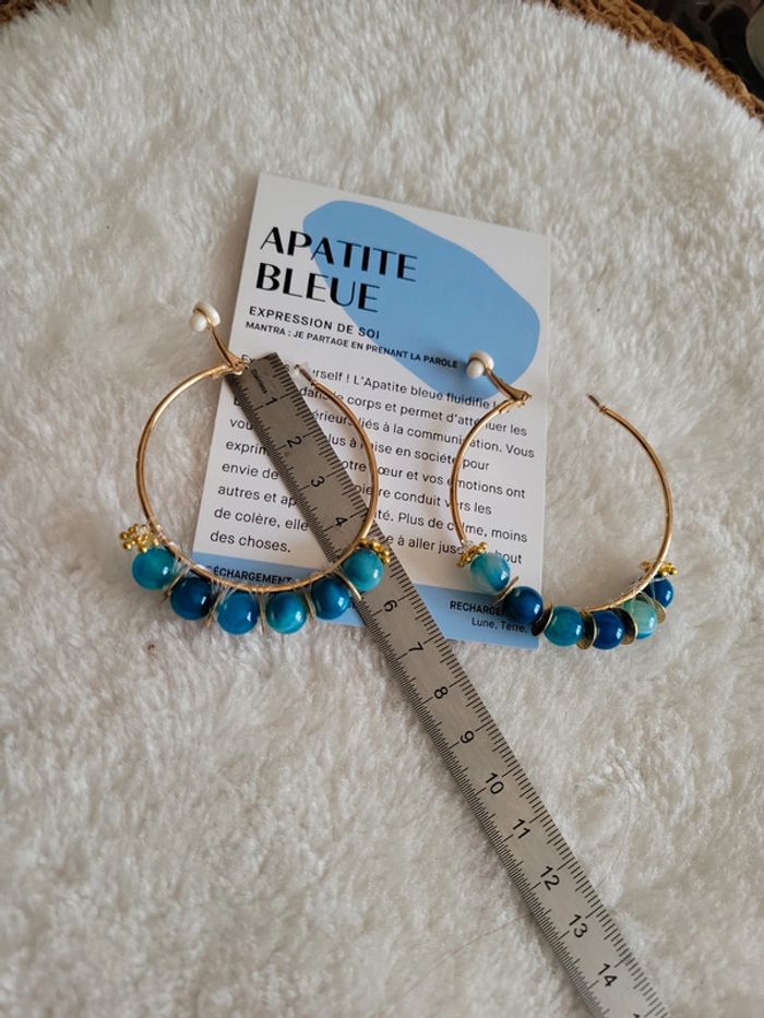 Creoles et apatite bleue. Creoles en acier inoxydable gold Hyppoallergenique Neuves.