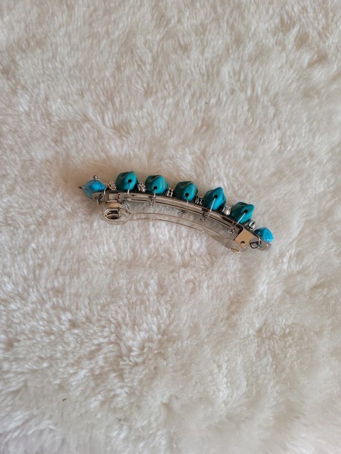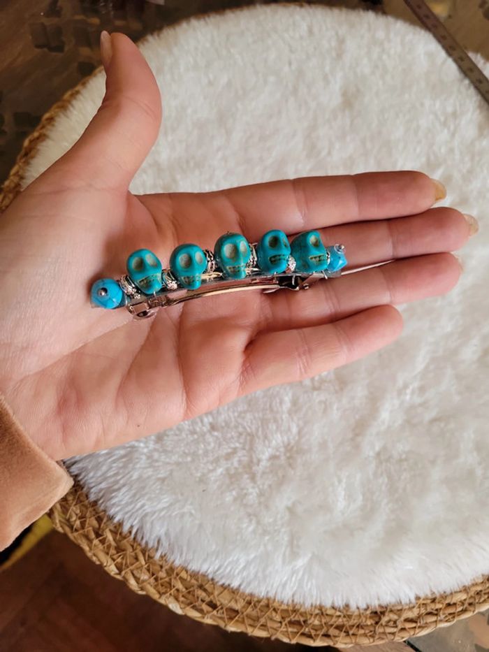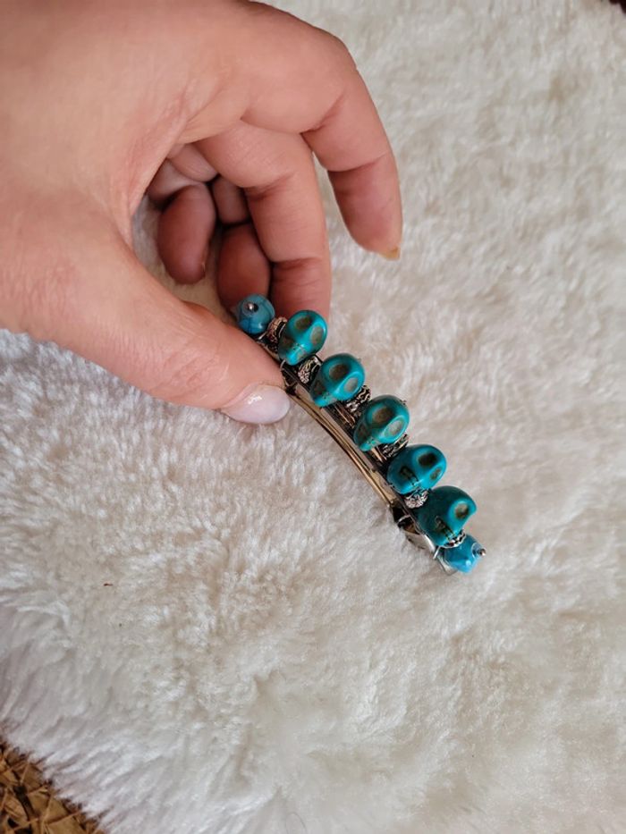 Jolie barette, motif têtes de mort turquoises. Neuve. Bon maintien des cheveux. Lot possible, sur demande, avec d autres articles de mon dressing. Envoi rapide et soigneux