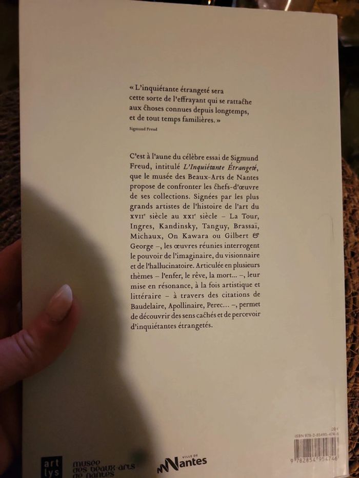 À propos "L'inquiétante étrangeté sera cette sorte de l'effrayant qui se rattache aux choses connues depuis longtemps, et de tout temps familières" - Sigmund Freud. C'est à l'aune du célébre essai de Sigmund Freud, intitulé L'Inquiétante Etrangeté, que le musée des Beaux-Arts de Nantes propose de confronter les chefs-d'oeuvre de ses collections. Signées par les plus grands artistes de l'histoire de l'art du XVIIe siècle au XXIe siècle - La Tour, Ingres, Kandinsky, Tanguy, Brassaï, Michaux, On Kawara ou Gilbert et George -, les oeuvres réunies interrogent le pouvoir de l'imaginaire, du visionnaire et de l'hallucinatoire. Articulée en plusieurs thèmes - l'enfer, le rêve, la mort... -, leur mise en résonance, à la fois artistique et littéraire - à travers des citations de Baudelaire, Apollinaire, Perec -, permet de découvrir des sens cachés et de percevoir d'inquiétantes étrangetés.