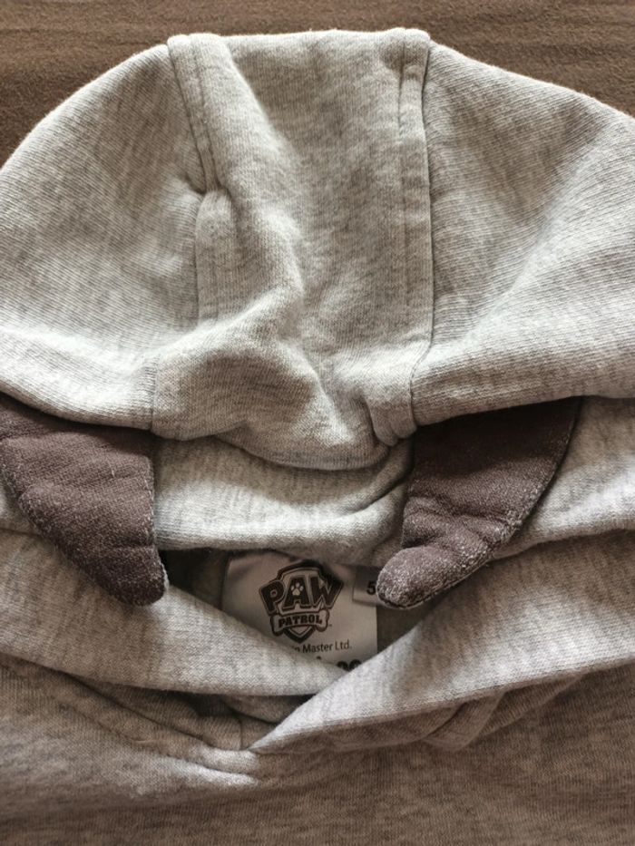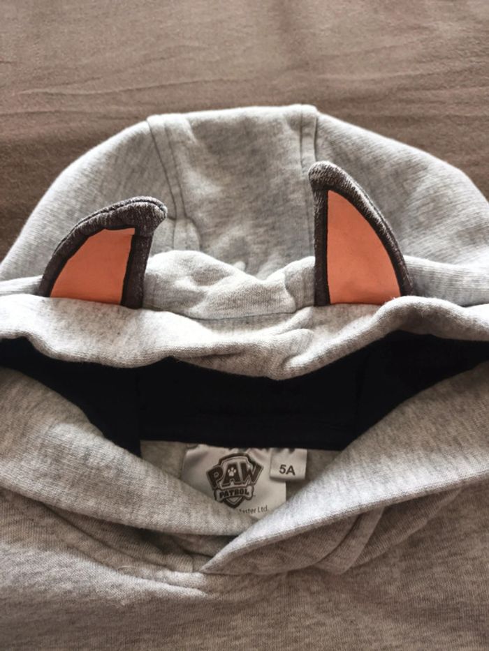 Sweat en 5 ans Pat patrouille Oreille sur la capuche (légèrement abimé : la couleur s'enlève) Le flocage craque un peu (voir photo)