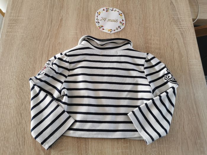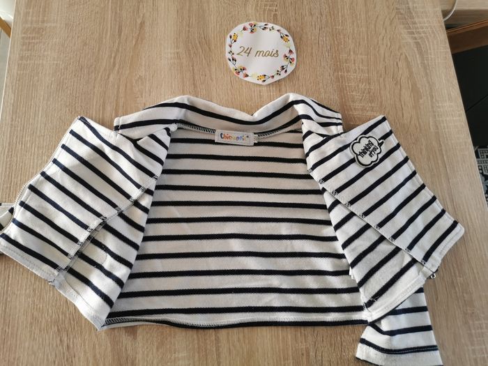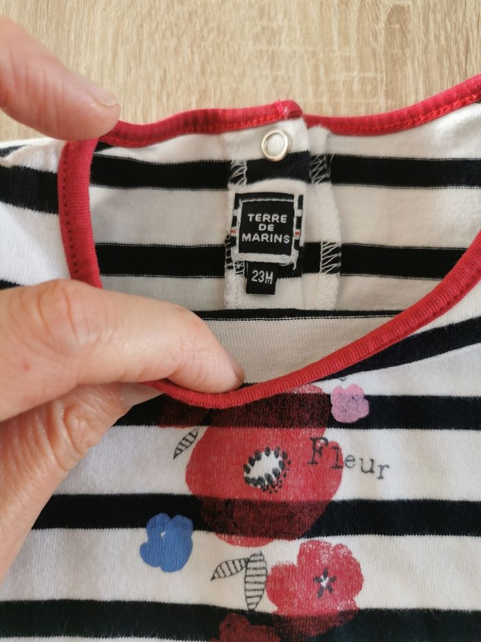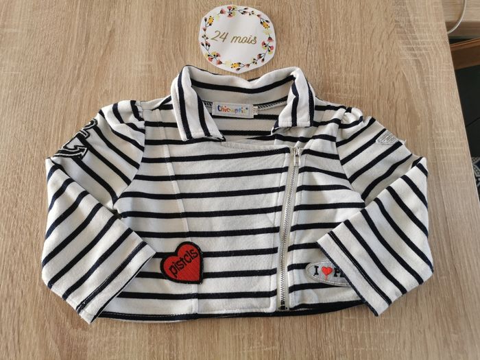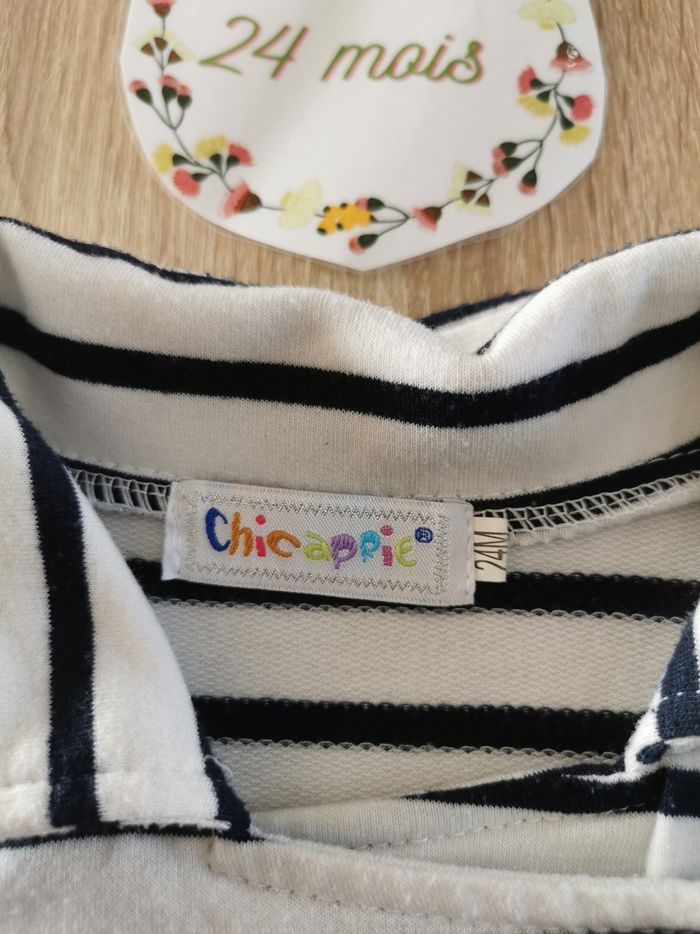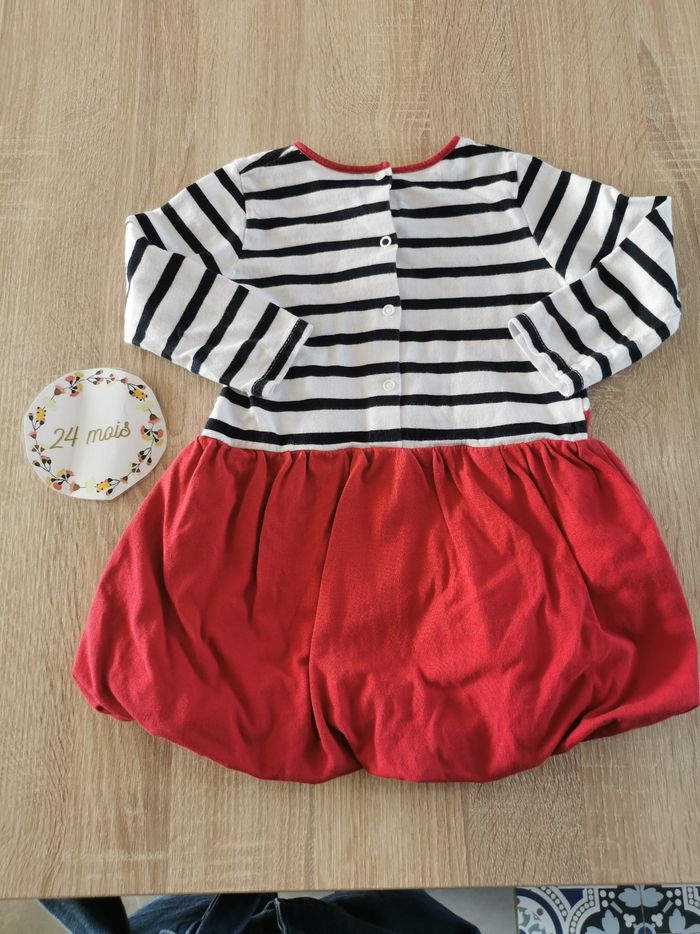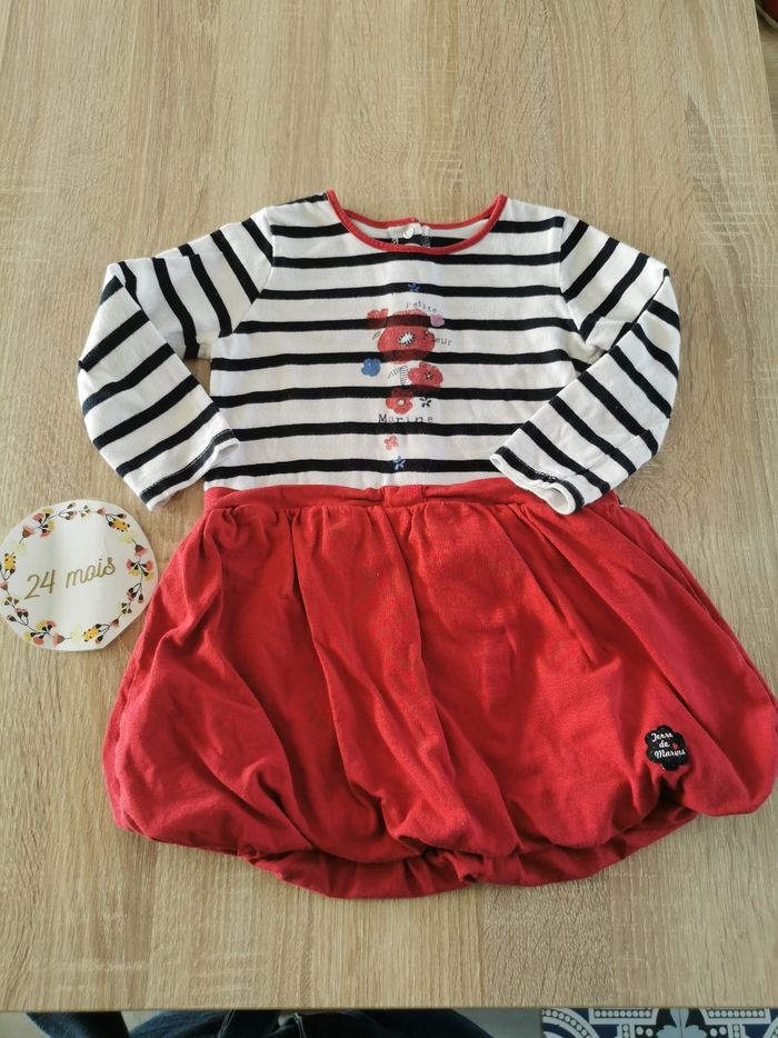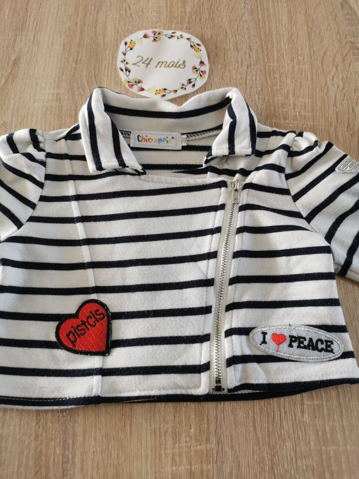 Ensemble fille en taille 24 mois composé ✅1 robe manches longues terre de marin portée mais reste en tres bon etat general ✅Veste marin avec un côté un peu rock de la marque Chicaprie. Elle a été portée mais reste en tres bon etat general.
