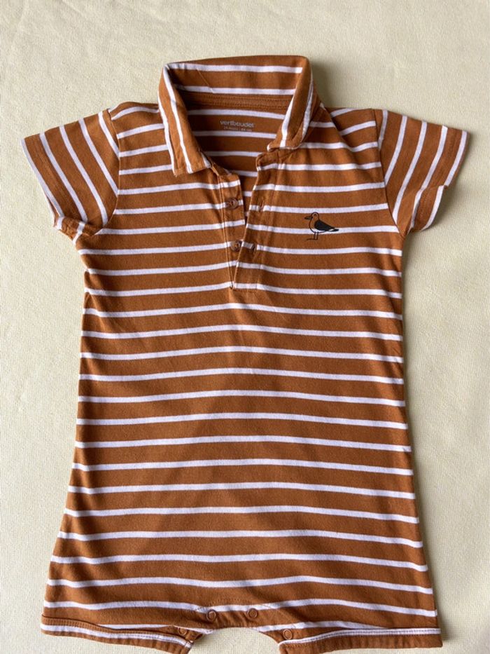 Combinaison courte bébé été vertbaudet motif rayures marron blanc avec oiseaux
