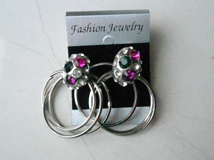 Boucles d’oreilles anneaux avec pierres rouges et vertes Poussettes fermoirs. Marque Fashion Jewelry. Neuve, jamais servie.