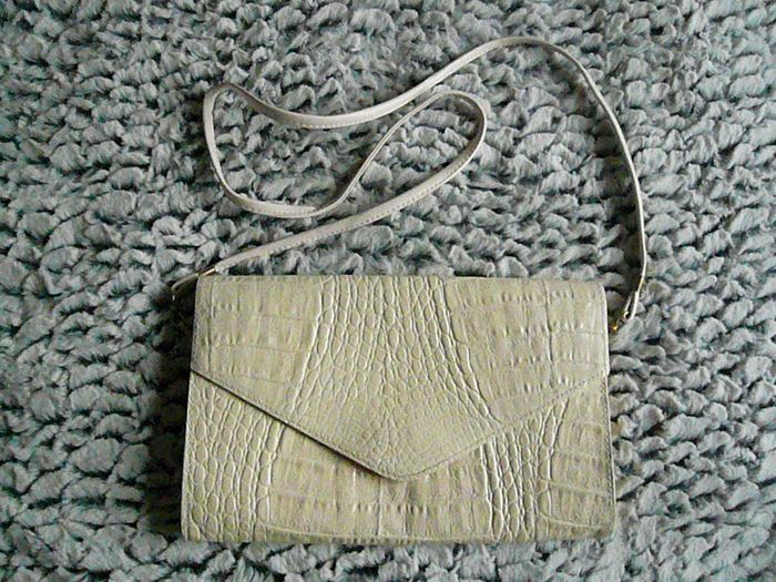 Pochette en cuir texturé blanc cassé effet croco. Marque Genuine Leather. Avec bandoulière amovible. Intérieur en velours noir. Dimensions : 27,5 cm x 17,5 cm. Neuf.