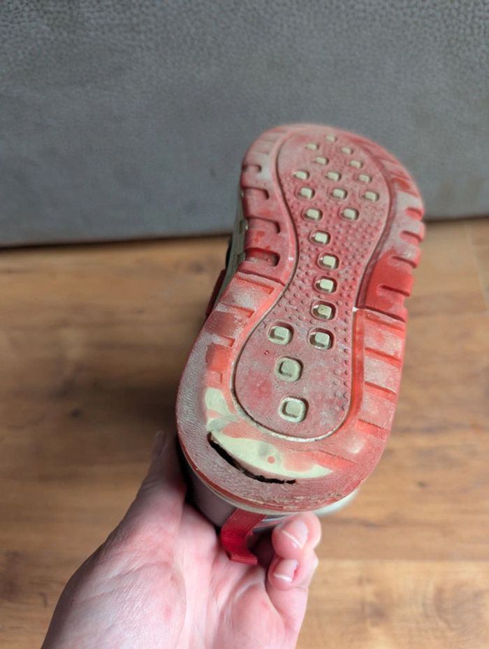 Bon état (semelle du dessous abîmé + sur le devant d une des 2 chaussures ou le bord est décollé, voir photos). Taille 30. Le talon s allume quand on court. A scratch.