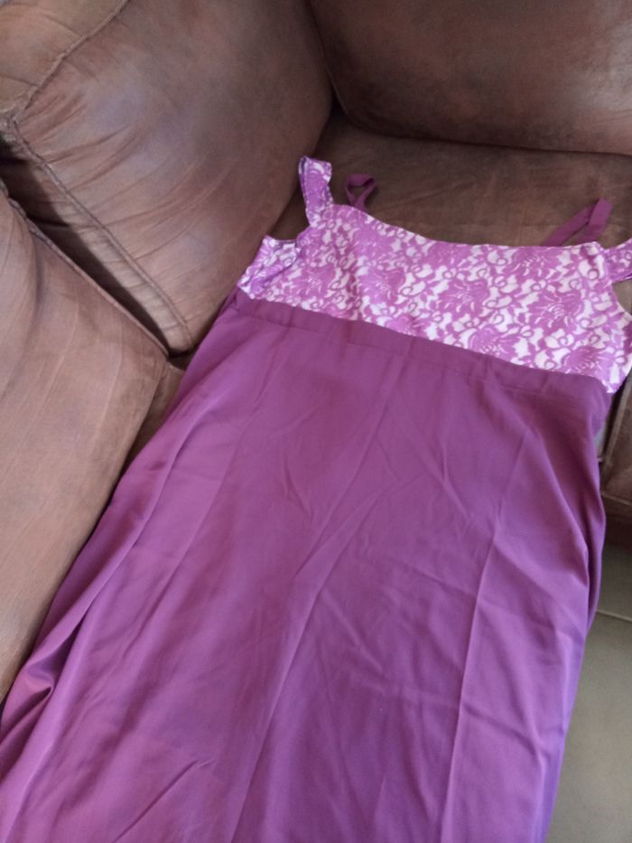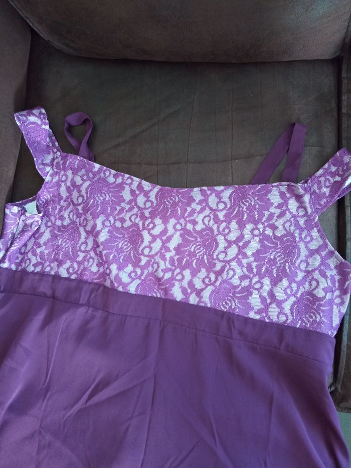 Ravissante Robe d'été Taille 5XL Couleur: Violet et Blanc Coupe évasée, à double bretelles, entièrement doublée car le tissu extérieur est transparent Se ferme sur le côté avec 1 fermeture éclaire Dimensions: Longueur 114cm - Aisselles à aisselles 68cm Matière: 100% Polyester ROBE Neuve, jamais portée