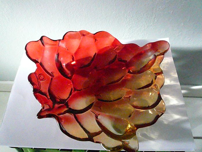 Coupelle en verre en forme de feuille de vigne. Avec des petits pieds. Peut servir pour des biscuits apéritifs, comme vide poches, ou simplement en décoration. Dimensions : 24 cm x 22 cm. Etat neuf.