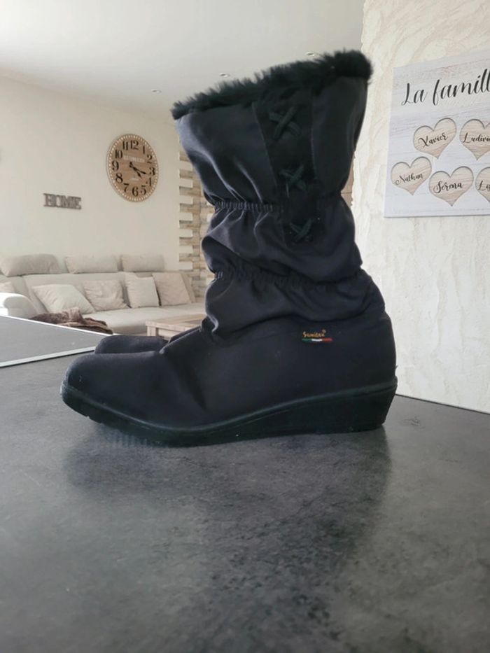 Boosts imperméables en 42 noires Valeur neuves 69.99€ ▪︎Fourrées, doublure chaude et semelle souple. ▪︎Talon 4 cm ▪︎100% Polyester, Doublure: 80% Polyester, 20% Acrylique, Semelle: 100% Elastomère, Semelle Intérieure/Première: 100% Synthétique