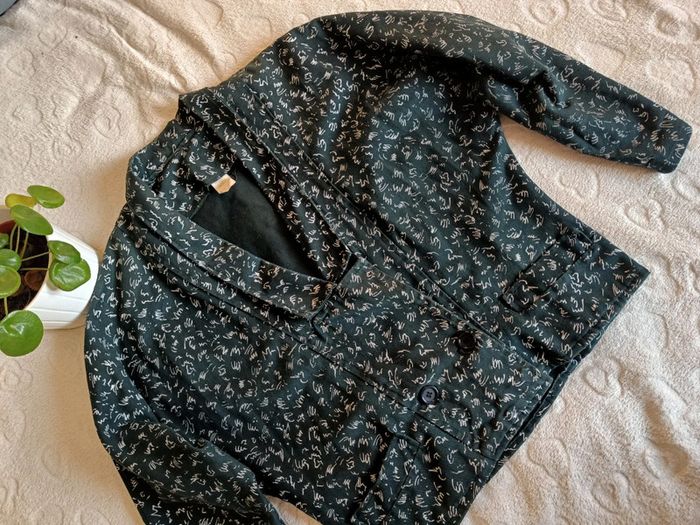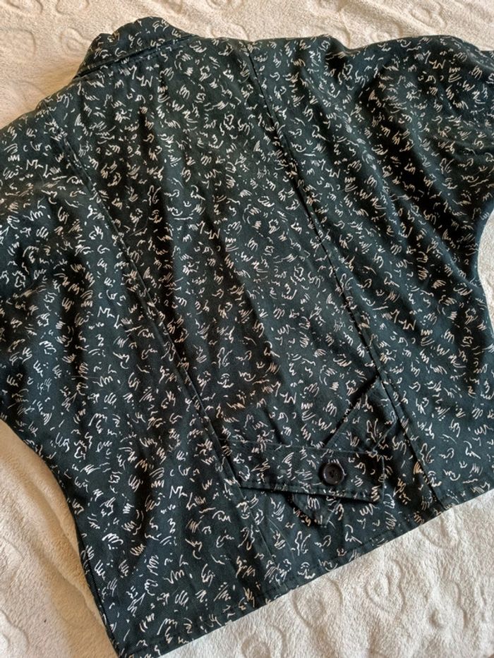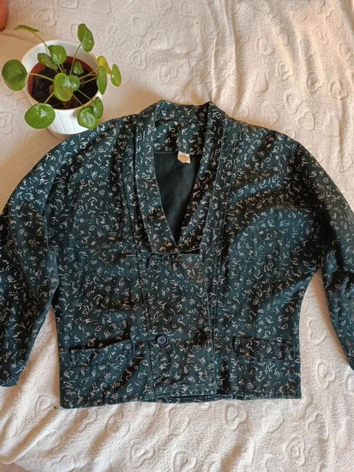 Blazer vintage coupe large en haut et resserré à ma taille style bomber Très originale, jolie détaillé de bouton devant et derrière Correspond à un M je pense, l'étiquette est effacé, je vous laisse les mesures au cas où longueur 57cm et largeur aisselles 55cm, largeur taille 44cm