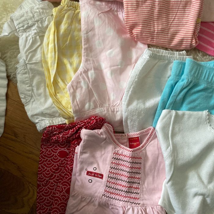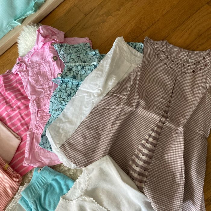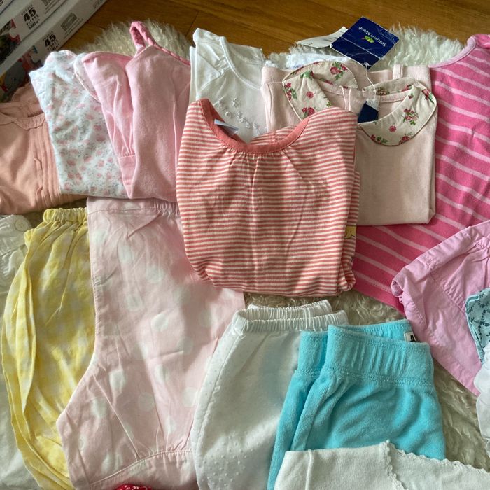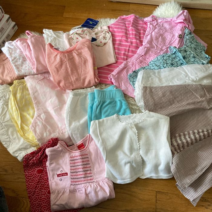 Lot de vêtements été fille Taille 12 m 5 robes Cardigan Ensemble t-shirt et pantalon 5 shorts Blouse 2 polos 3 t-shirts Babygro,orchestra,obaibi,baby girl,dpam, sergent Major, Kiabi,tex, Disney, acanthe, graines de blé, Baby, gap