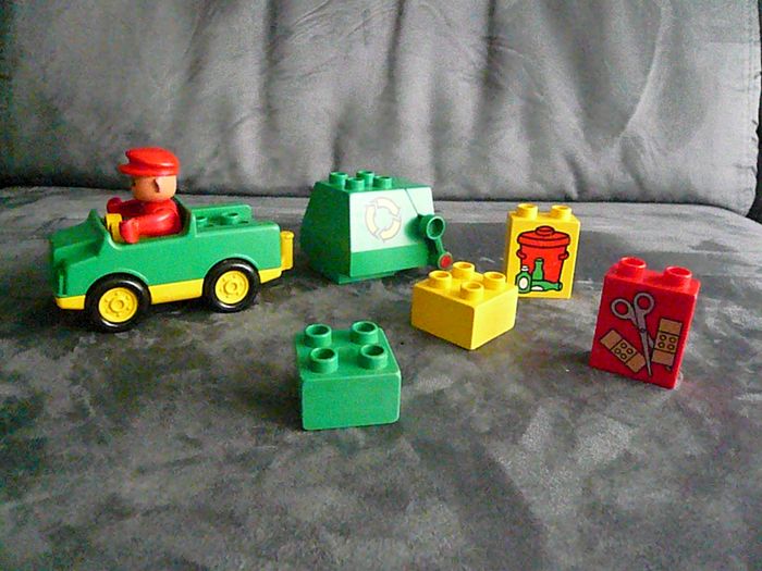 Set de Lego Duplo composé d’un camion poubelle de recyclage avec sa benne qui s’ouvre, d’un personnage et de briques pour s’amuser à recycler. Très bon état.