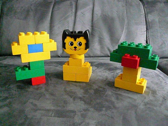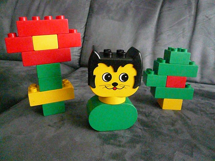 Set de Lego Duplo composé de 2 constructions en forme de chat, de 2 constructions en forme d’arbres, de 2 constructions en forme de fleurs. Des photos détaillées des constructions sont jointes. Très bon état.