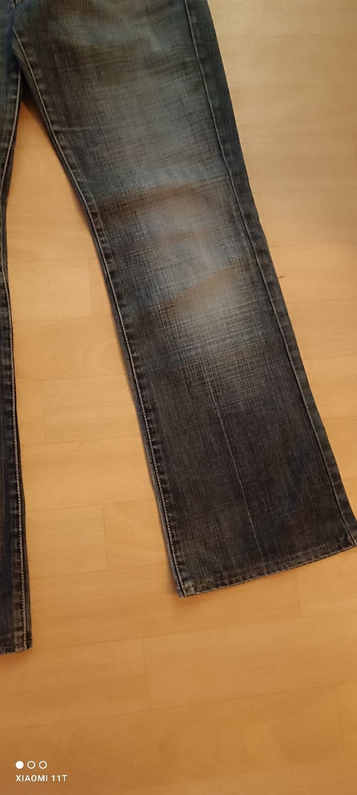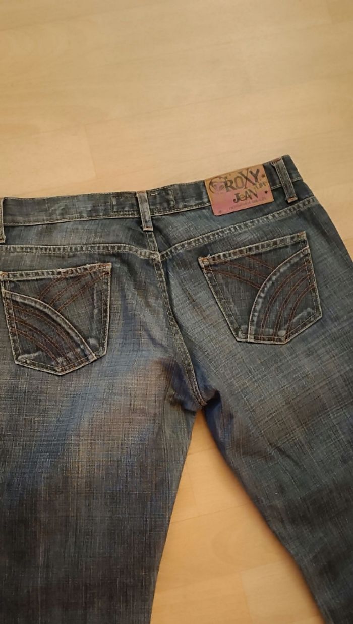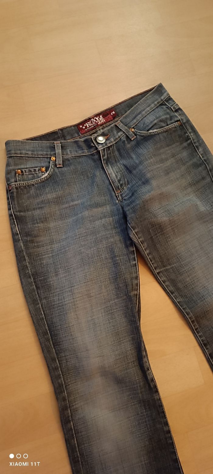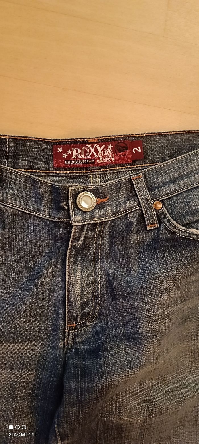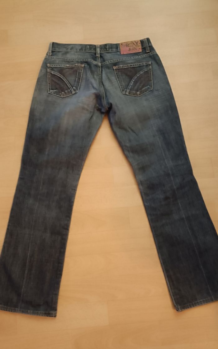 Jean femme taille 38/2 Roxy Coloris bleu Fermeture éclair + bouton Coupe évasée 100 % coton Longueur total 95 cm Longueur prise de la taille à l’entrejambe 29 cm Largeur taille 38 cm Largeur cheville 21 cm Très bon état