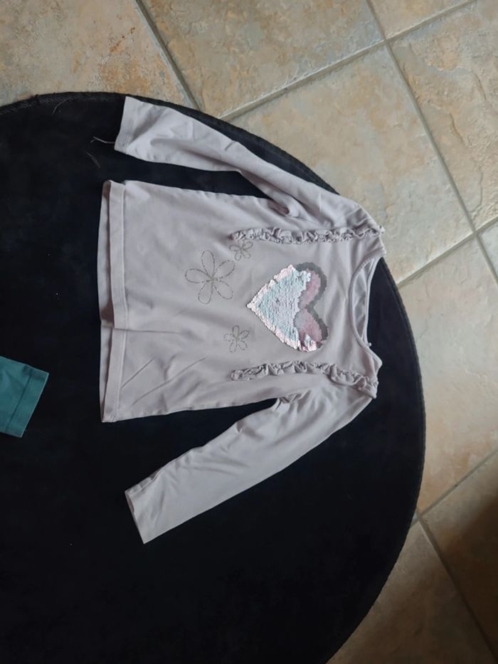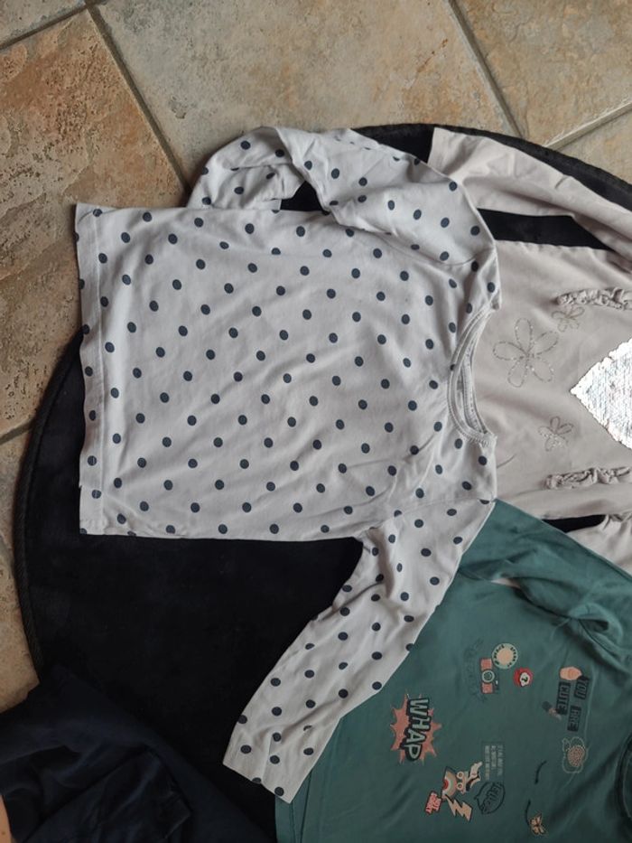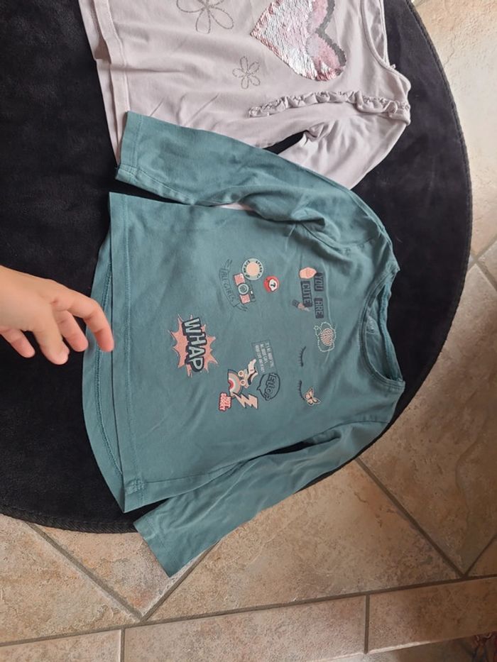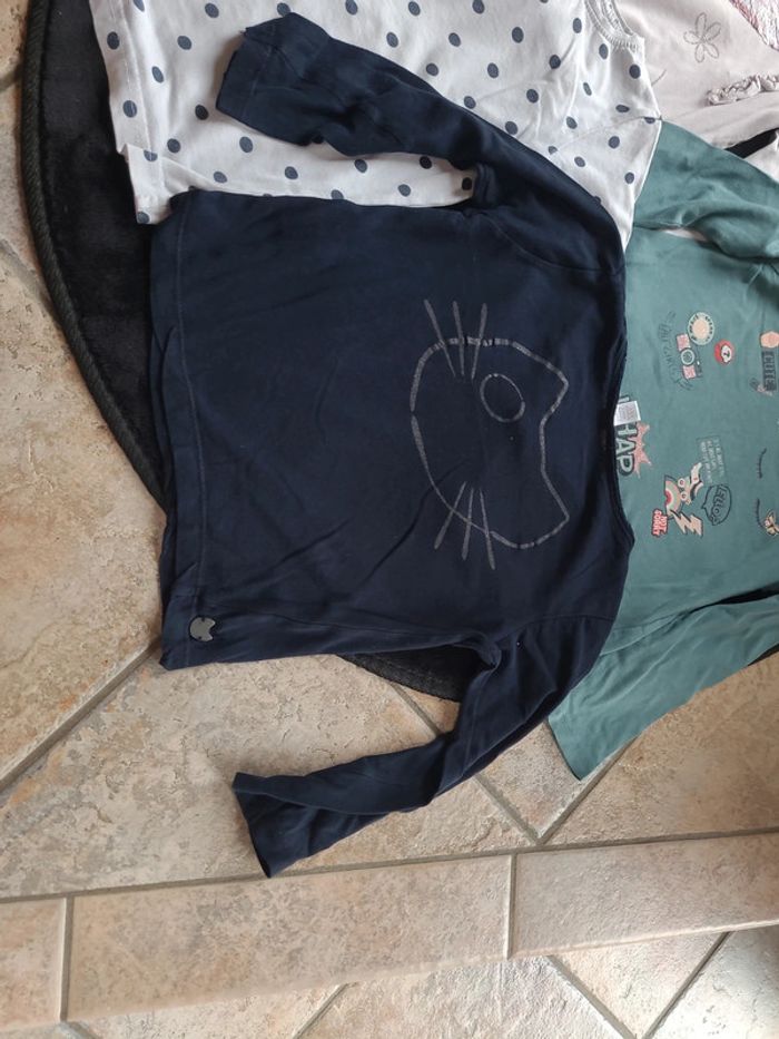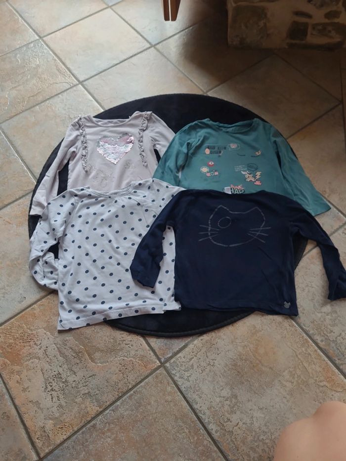 Lots 4 t-shirts Cœur : Orchestra Blanc pois : primark (tache bleu visible sur la photo) Chat : okaidi Vert : kiabi 4 ans