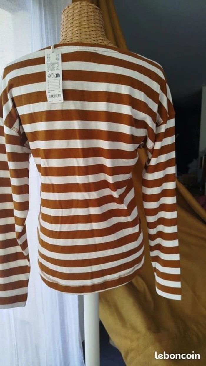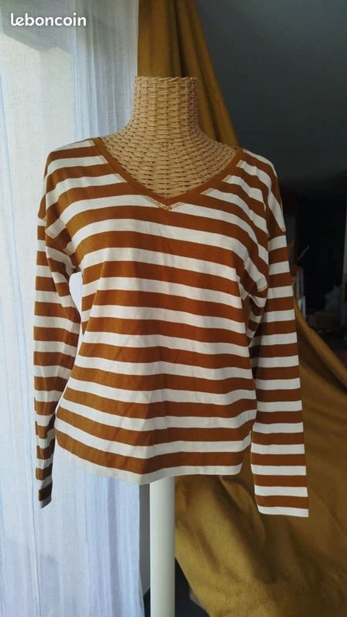 Tee-shirt manches longues à rayures caramel et crème. De la marque "Esprit". Taille M. Neuf. N'hésitez pas à regrouper vos achats pour optimiser les frais de ports. #vetementfemme38mykonoa #vetementneufmykonoa