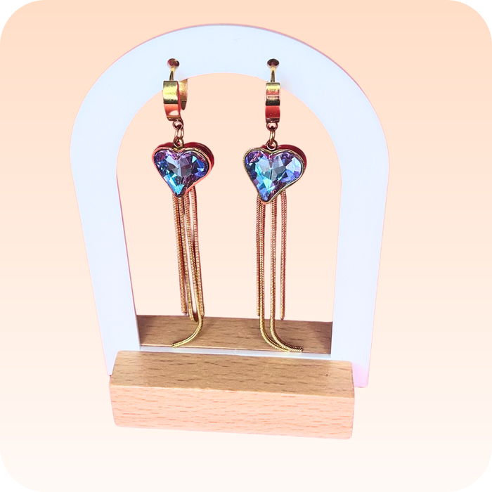 Boucles d'oreilles dorées Ariel romantiques et élégantes, ces boucles d’oreilles dorées arborent un cœur en strass rose bleuté et de fines chaînes pour un look glamour et raffiné Si tu veux plus de photo, et la voir porter, rdv sur meliamjc.com