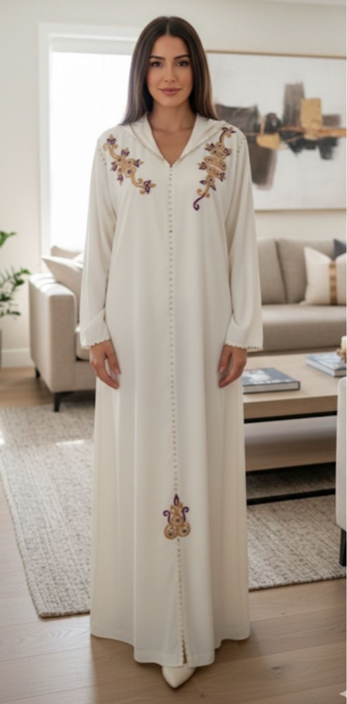 🌸 Élégante jellaba balnche avec broderies perlées. Idéale pour une occasion spéciale, une fête ou un look raffiné au quotidien. 🩷 Couleur tissu : blanc 🧵 Broderies perlés faites main 👗 Avec capuche perlée 📏 Taille : 40-42 ↔️ Dimension Aisselle à aisselle : 59 cm ↔️ Dimension Hauteur : 1m43 🔖État : neuf 💰 Prix d’origine : 90 € ⚠️ Vérifiez bien les mesures avant achat