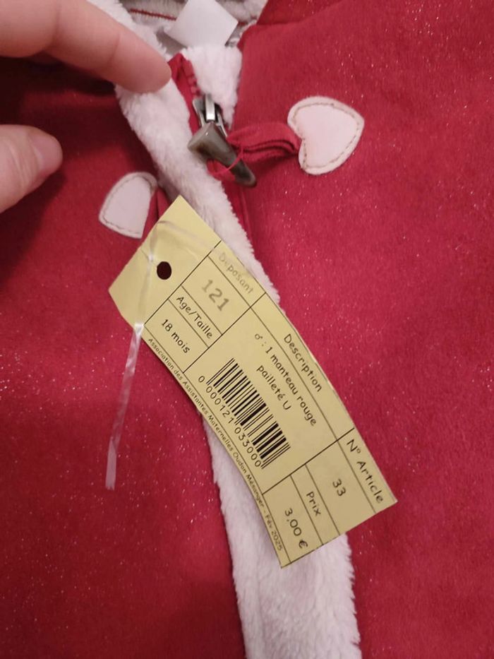 1 manteau rouge paillettes U TB état Mise en vente de mes articles invendus en bourse ce jour, petits prix, très bon état (sans trous, ni tâches). Réduction lot activée. Me demander pour tout renseignements