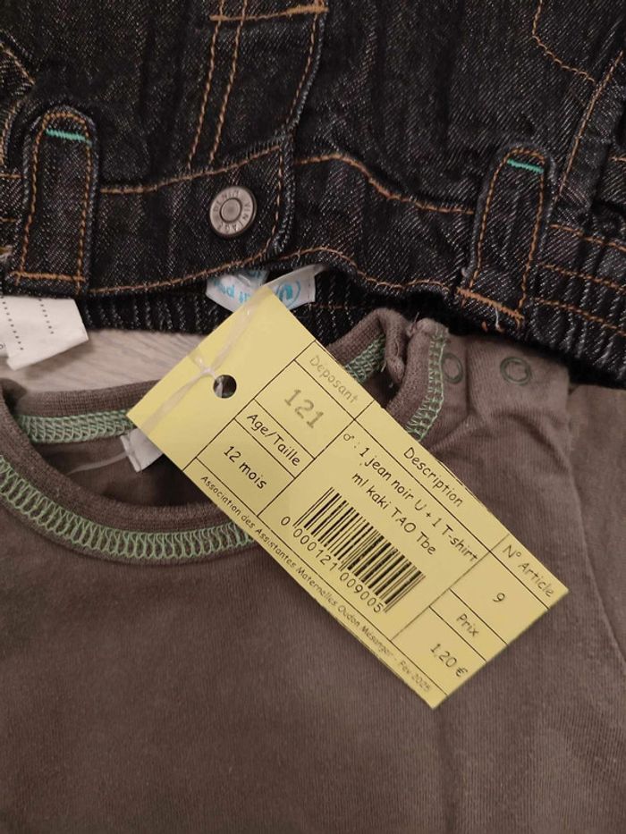 1 jean noir U 1 tshirt ml kaki TAO TB état Mise en vente de mes articles invendus en bourse ce jour, petits prix, très bon état (sans trous, ni tâches). Réduction lot activée. Me demander pour tout renseignements