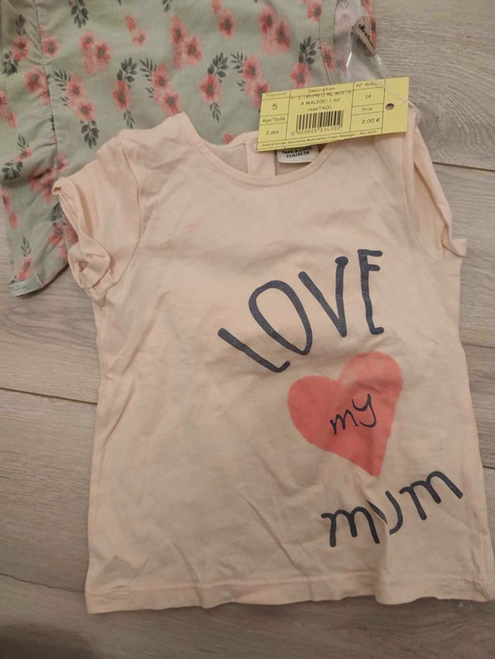1 tshirt ml bleu/vert avec fleurs BOITE A MALICE (1 bouton pression sur 2 ne ferme plus, en haut de l'épaule, ne change en rien) 1 tshirt mc rose TAO TB état Mise en vente de mes articles invendus en bourse ce jour, petits prix, très bon état (sans trous, ni tâches). Réduction lot activée. Me demander pour tout renseignements