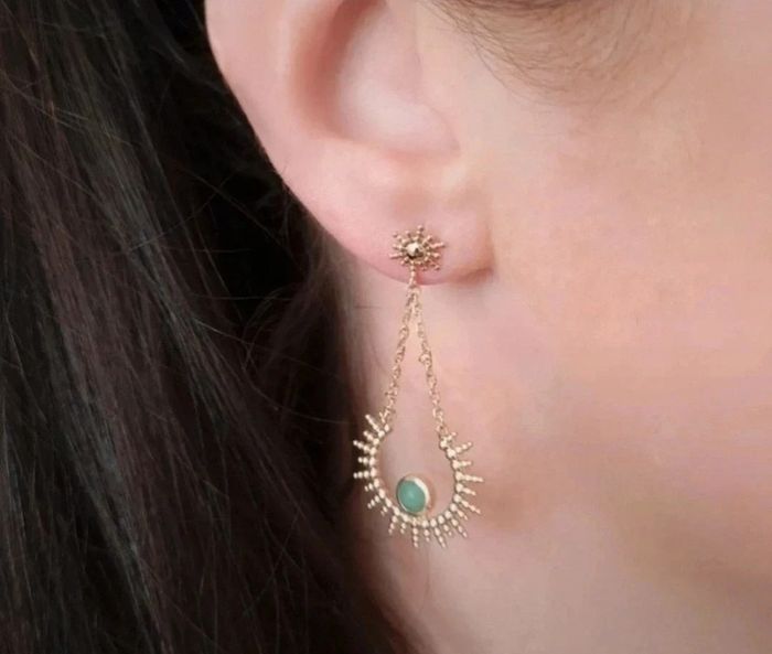 Boucles d'oreilles pendantes longues soleil en plaqué or et aventurine verte