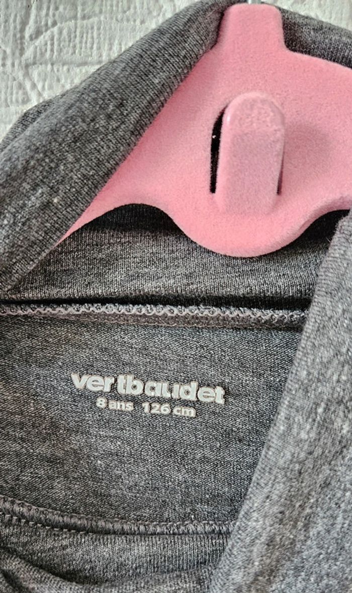 Le gris n'a pas été porté. Le rose possède un mini trou réparé (cf photo), il est offert. Ces articles ne font pas parti des "basics", ils sont vendus à 13€ l'unité. 8 ans, vertbaudet