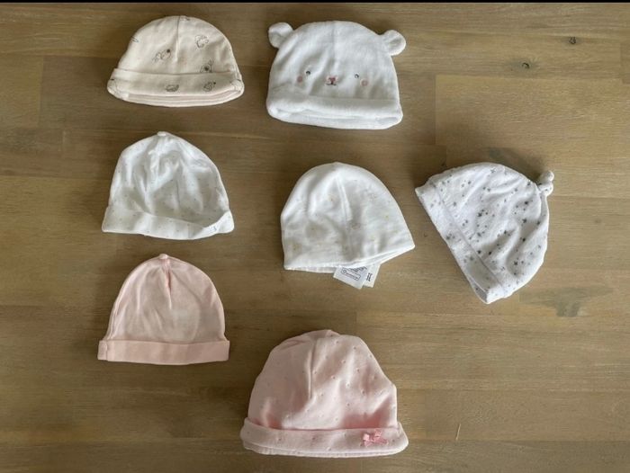 Lot de 7 bonnets naissance 4 en velours et 3 en cotons Différentes marques Sergent Major, la redoute, H&m Quasiment tous neuf