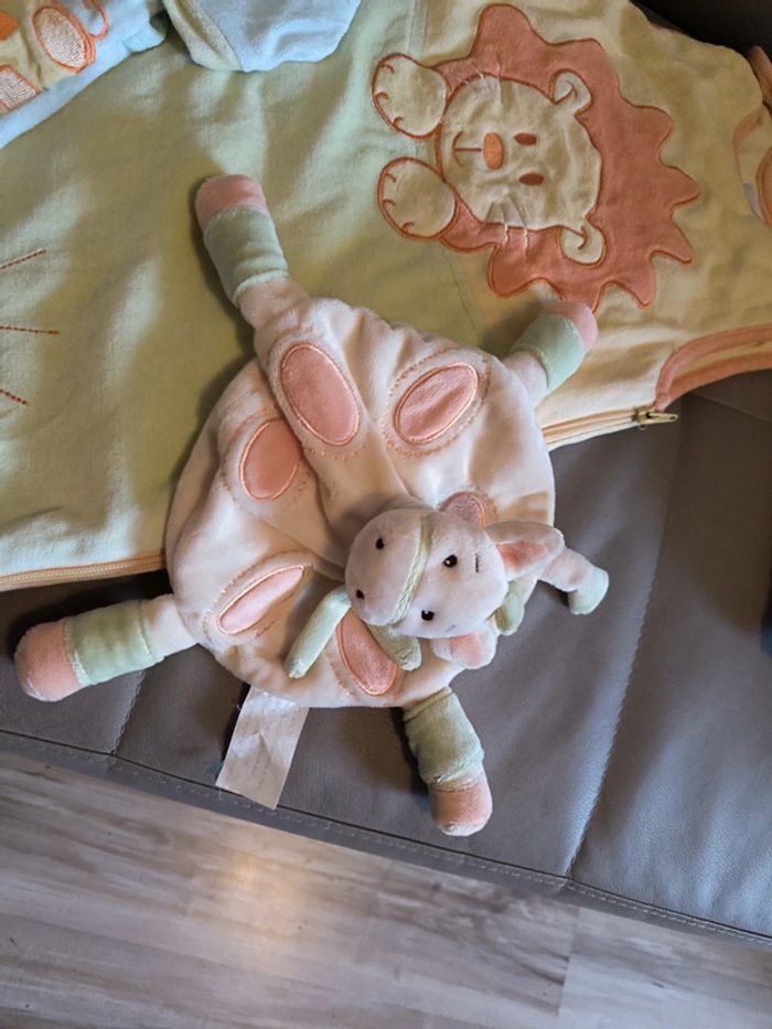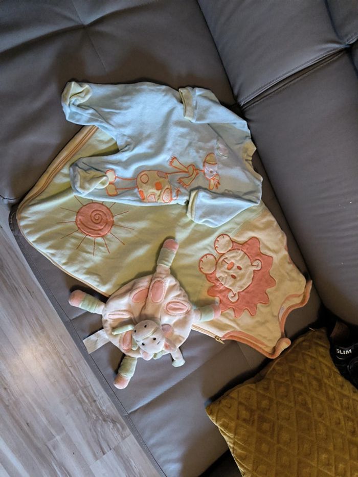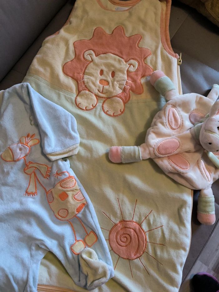 Lot gigoteuse 6mois jaune vert lion 🦁 Dors bien une pièce girafe 3 mois velours Doudou neuf girafe Le tout comme neuf en super état !