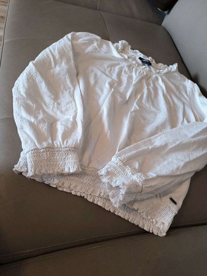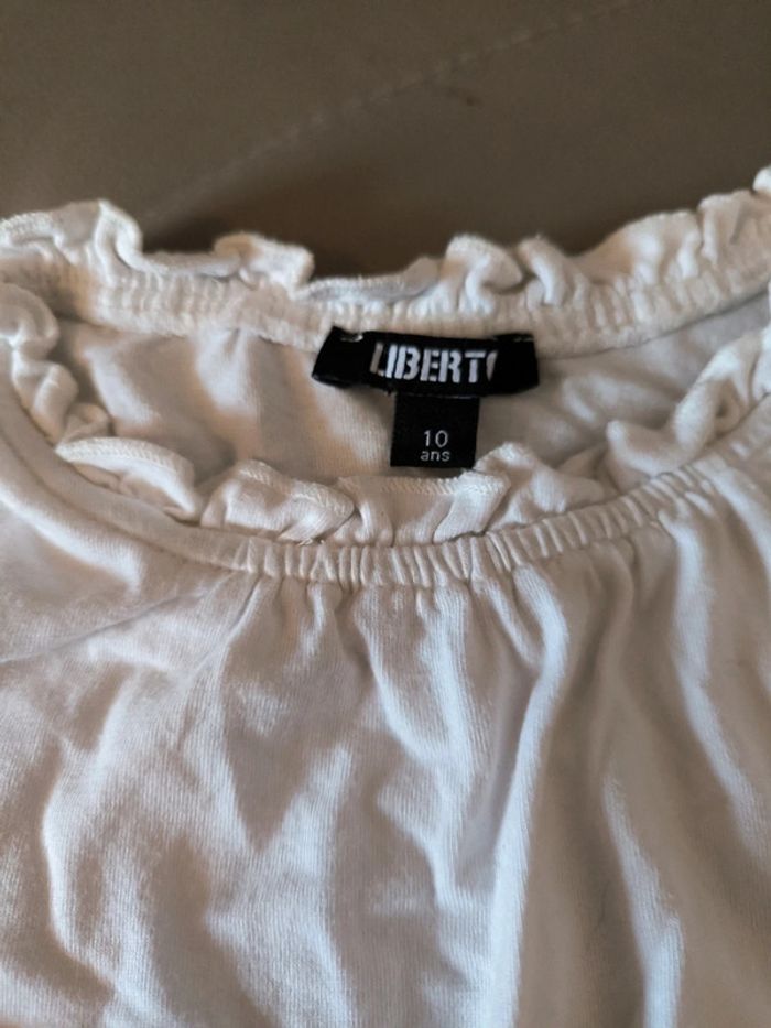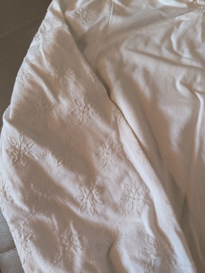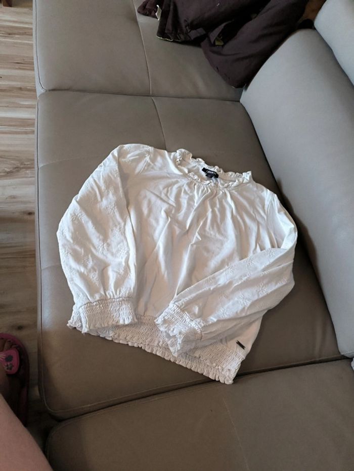 Haut manches longues écru avec motif fleurs col volant Deux petites tâches