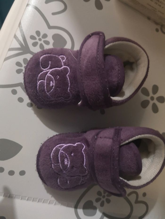 Petits chaussons ourson violet avec scratch pour ajustement et mise au pied facile 3 mois à 6 mois