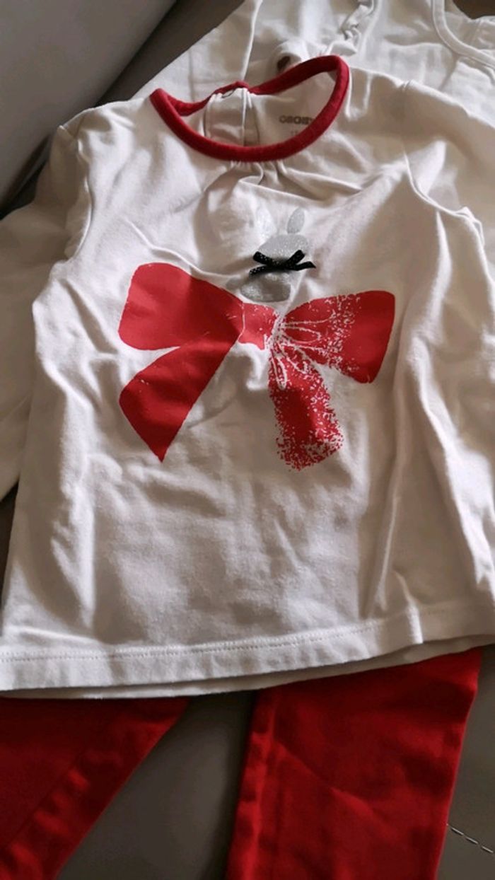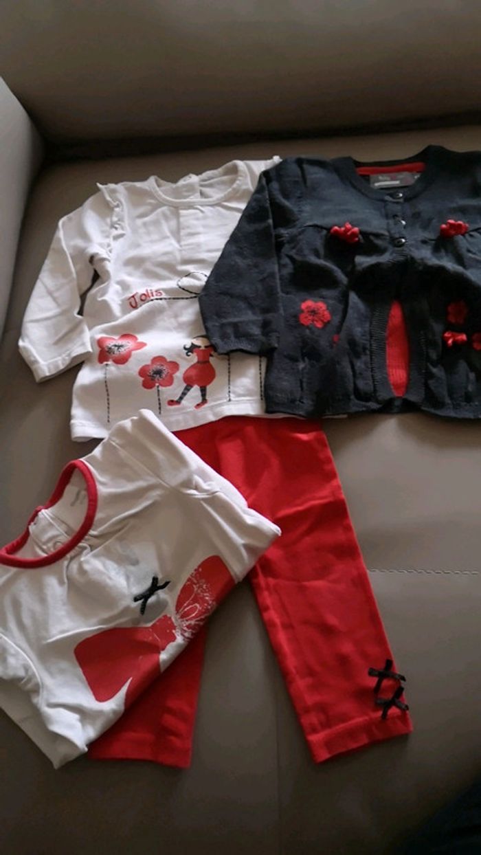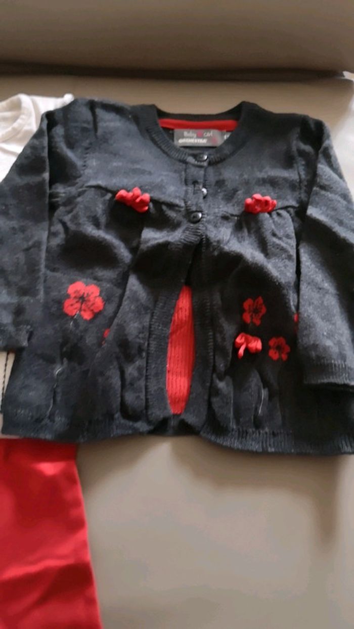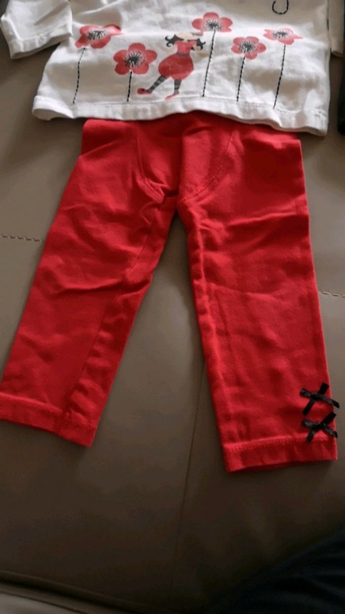 Legging rouge avec petits flits noirs sur la cheville 2 t shirt manches longues 1 theme coquelicot l autre lapin flot 1 gilet noir avec fleurs coquelicots rouges