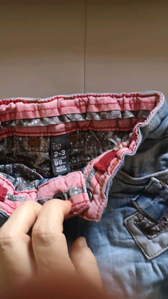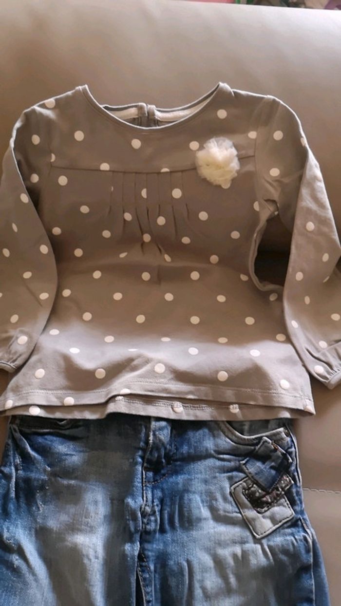 * Jean Zara 2-3 ans très beau confort et moderne * Top manches longues gris à pois blanc et fleur. Fermeture bouton à l'arrière verbaudet * Top manches longues fleuri 23 mois taille grand 2-3ans orchestra petite tâche peu visible voir dernière photo