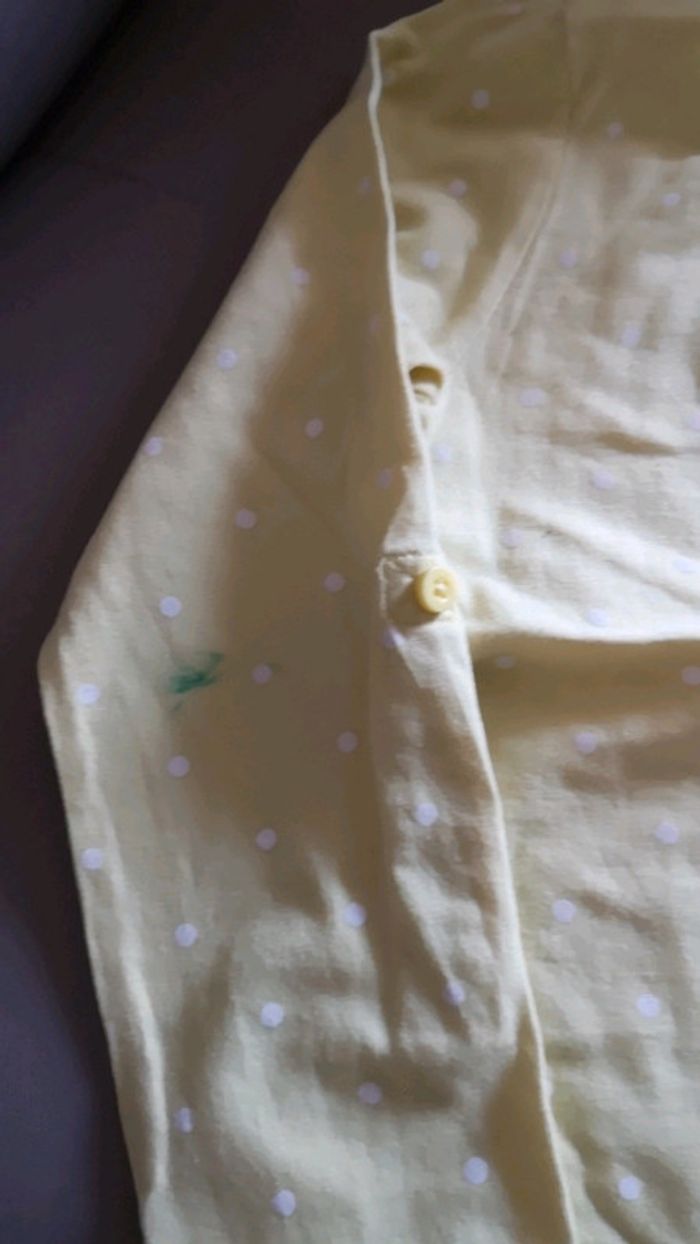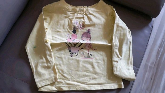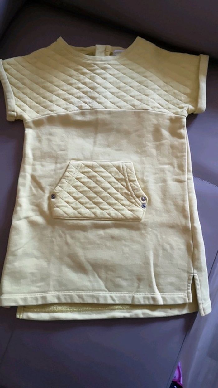 5 ans deux pulls jaunes sweat avec inscription argenté Robe manches courtes avec fermeture éclair libellule t-shirt manches longues manches rabattable par un bouton petites tâche de feutre sur la manche droite