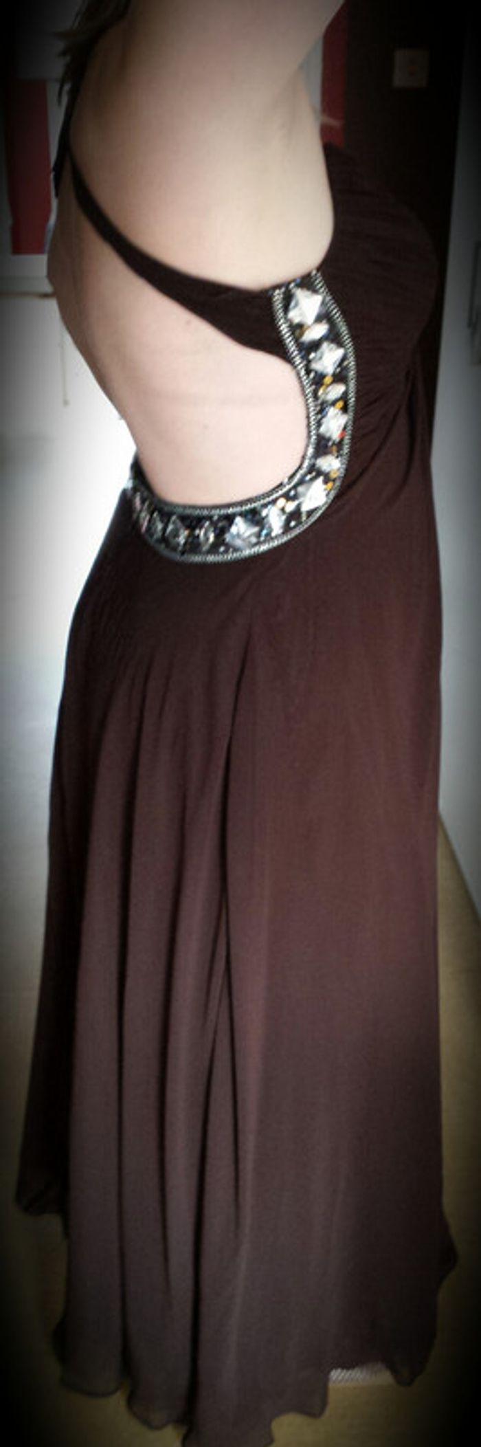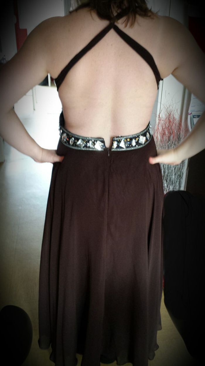 robe de cocktail en mousseline chocolat dos nu avec bordure bijoux