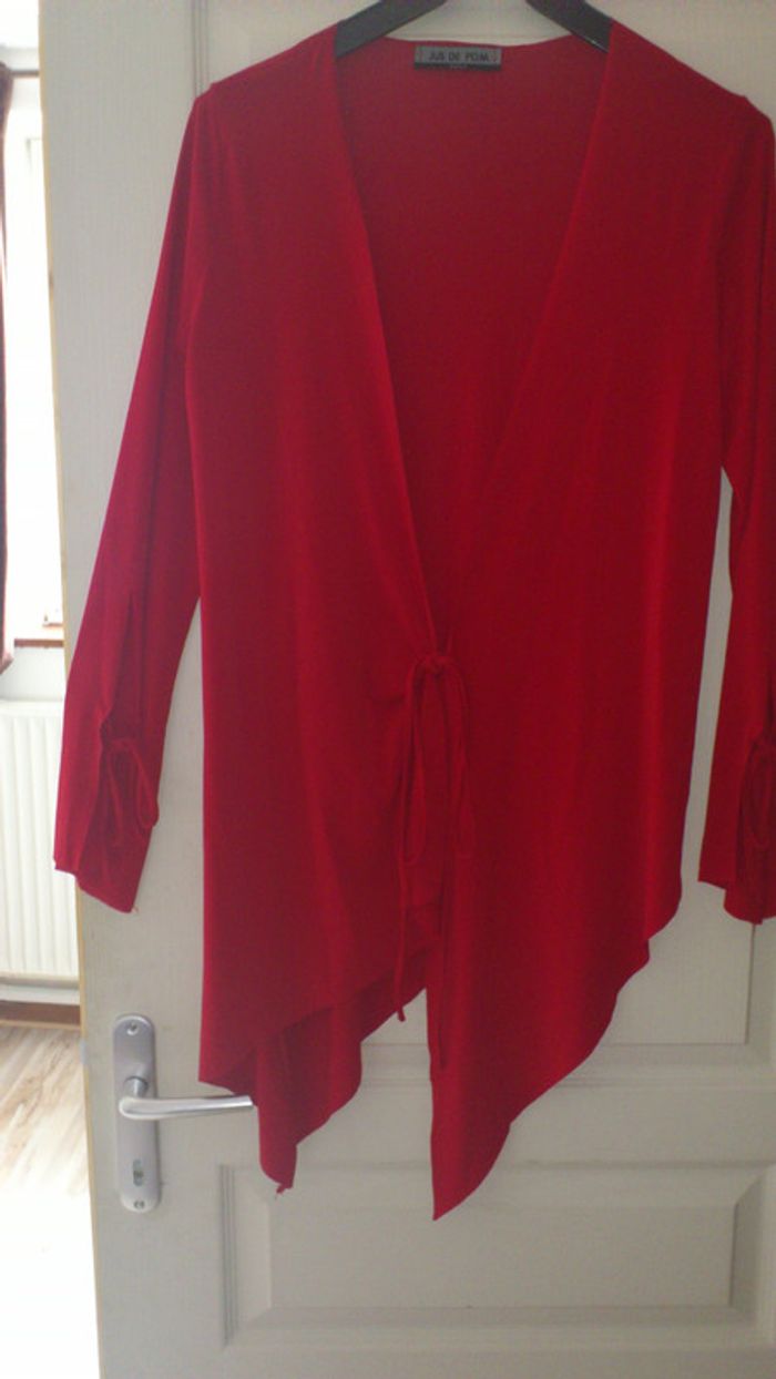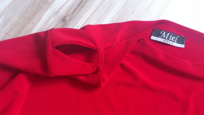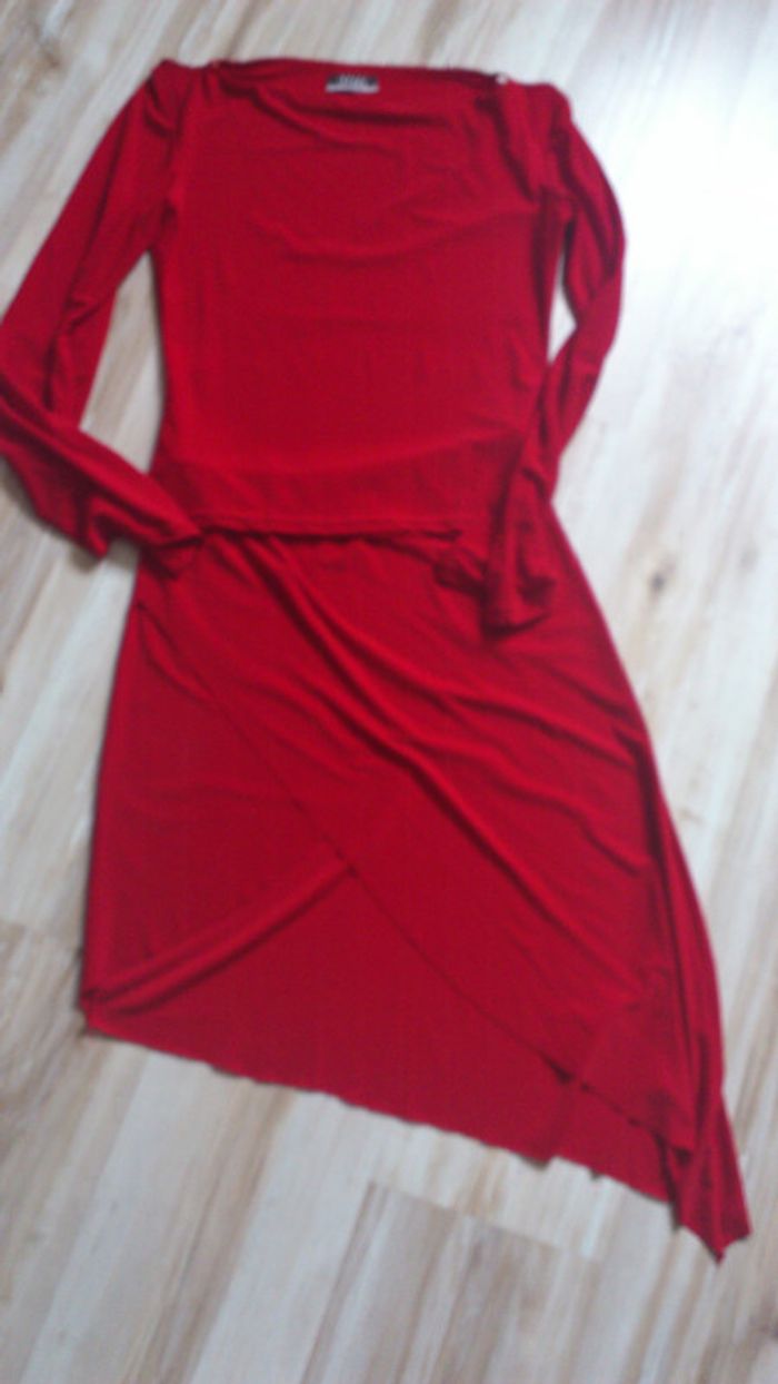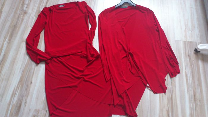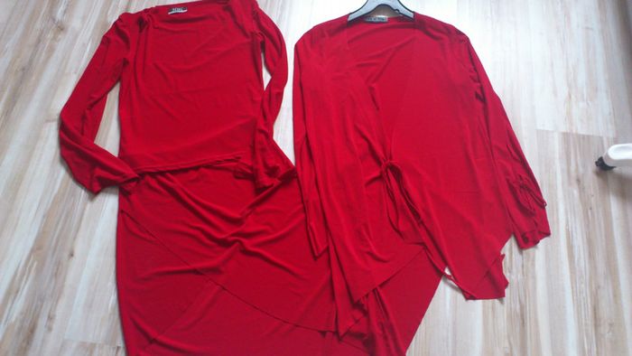 en polyester matière très souple et agréable à porter, très bon état comme neuf jupe + haut manches longues avec flots aux manches, gilet qui se ferment par lanières rouge vif jupe biseauté effet tango