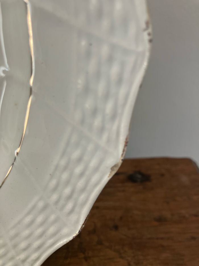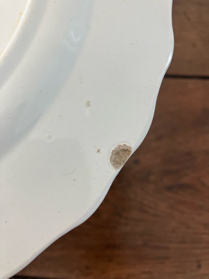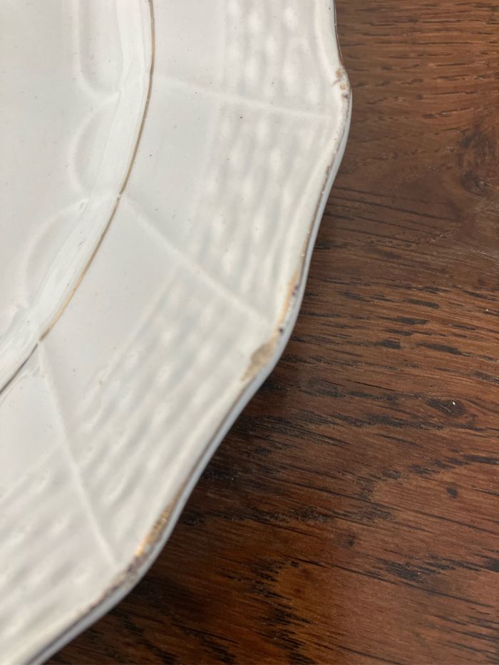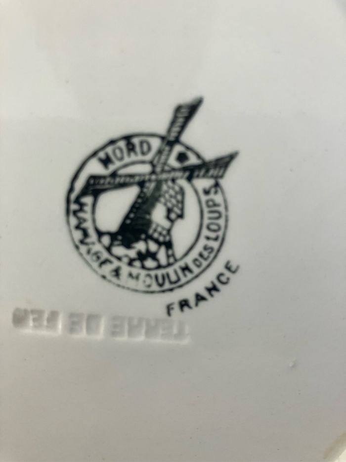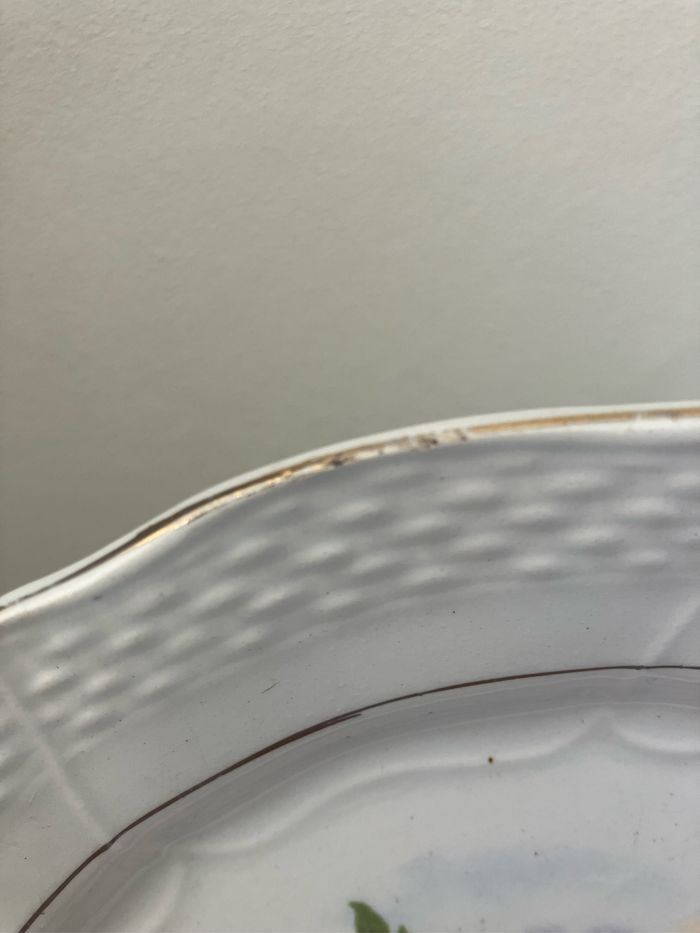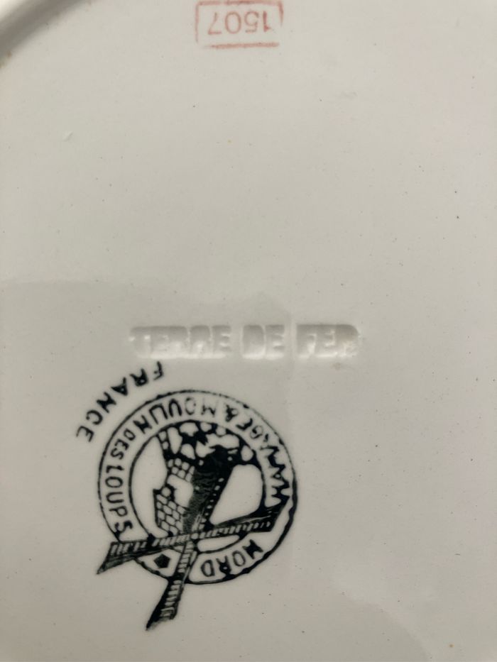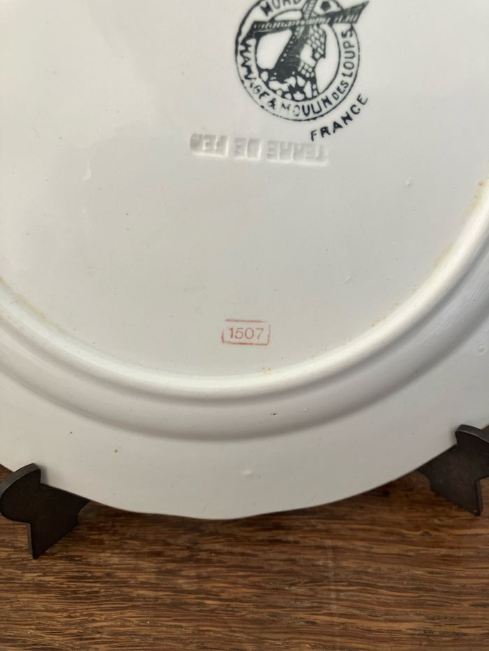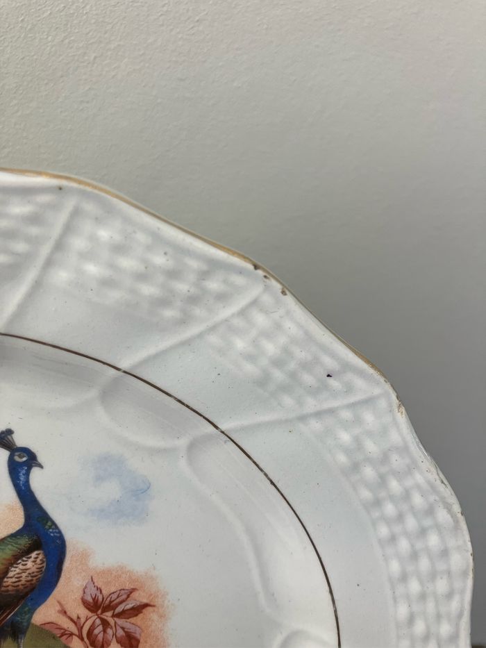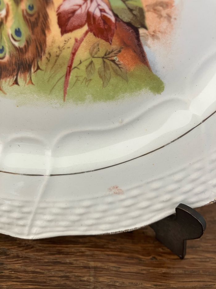 Cette assiette à dessert est ancienne. Terre de fer-Moulin des Loups—Hamage Numérotée 1507 Très beau motif coloré représentant un paon : les couleurs sont encore vives Elle est en bon état mais les défauts suivants sont à noter : - la dorure sur le pourtour est légèrement passée - une micro tache rosée sur la partie blanche (voir photo) - une micro ébréchure sur le pourtour (voir photo) - un impact (manque)plus important au dos (voir photo) Toutefois, ces défauts ne nuisent pas à l’esthétique de cette assiette Diamètre : 20 cm
