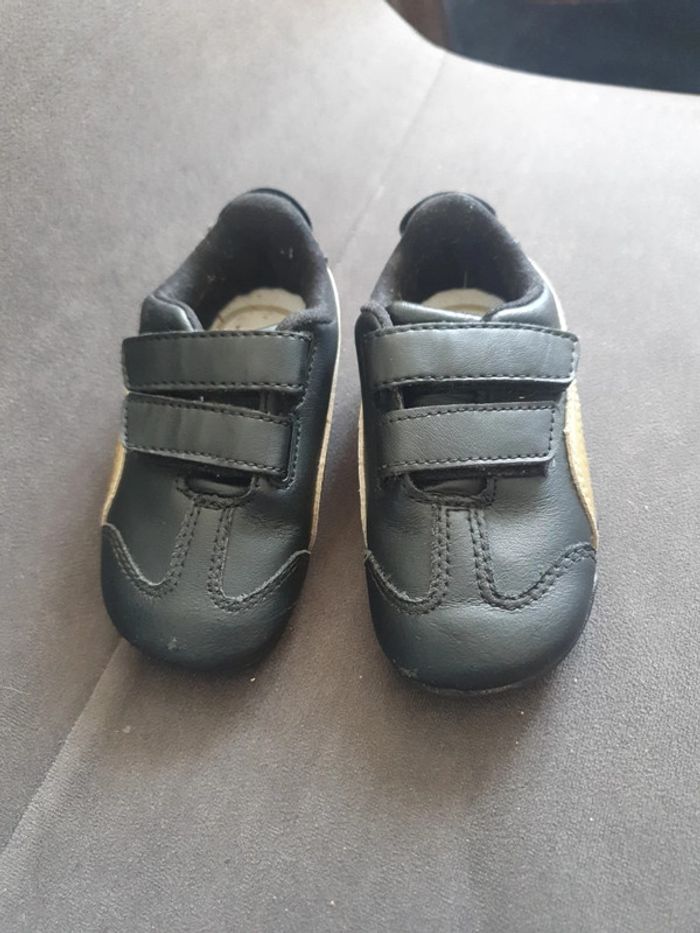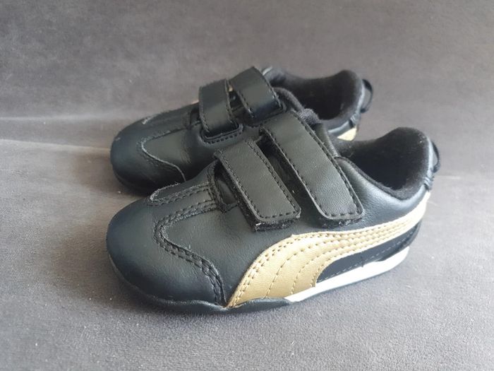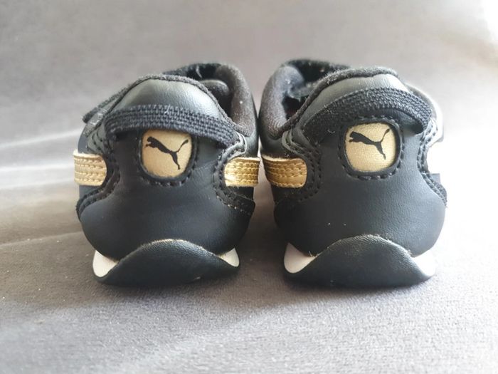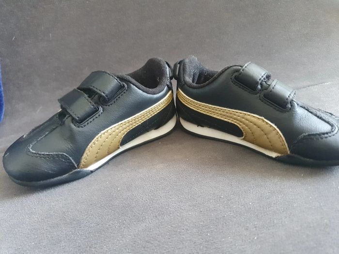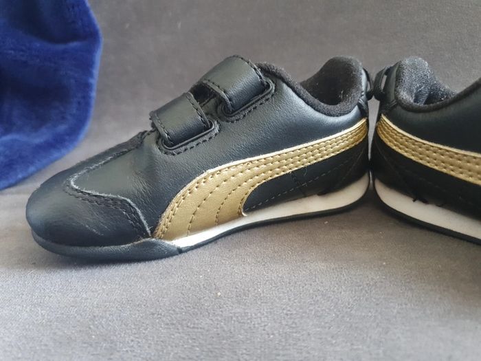 Basket puma très bonne état très peu porté 1 léger trace de frottement mais minime sur le boîte devant sinon elle sont comme neuf noir et or
