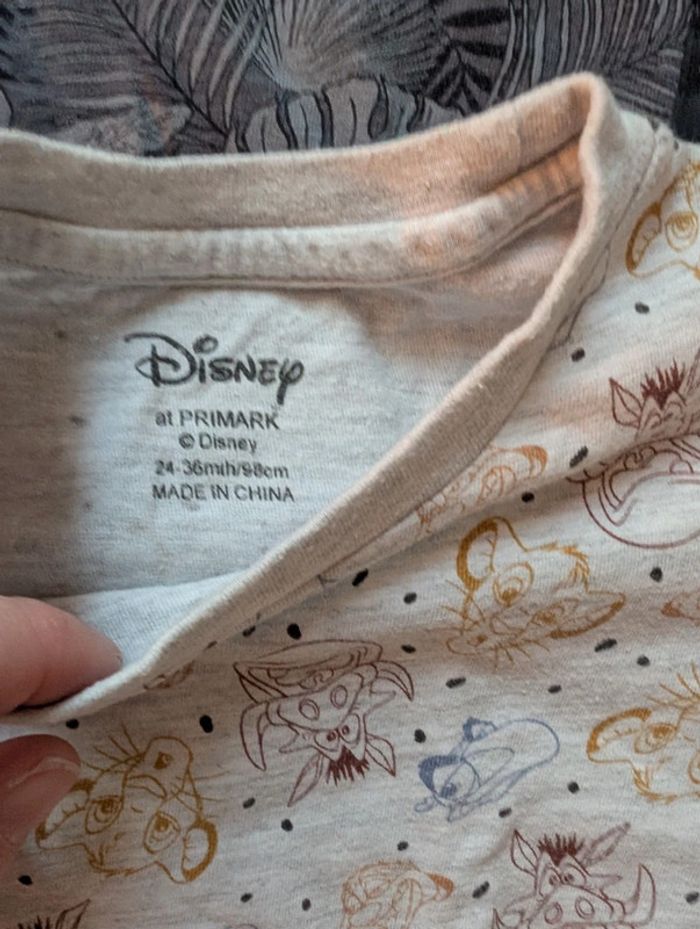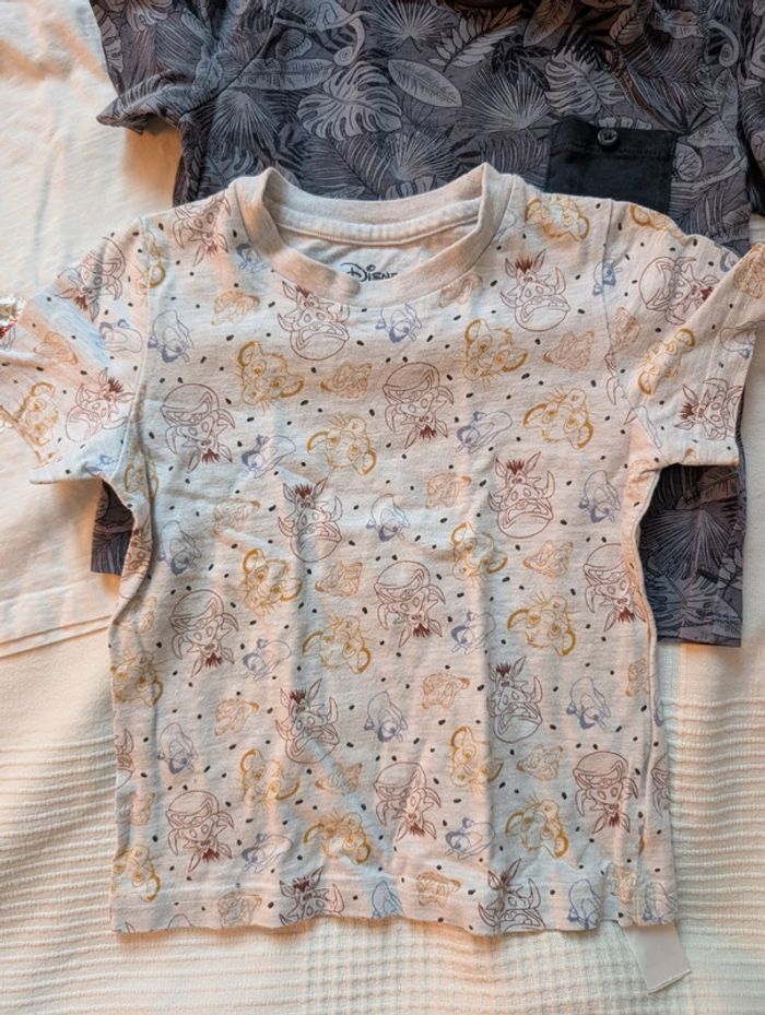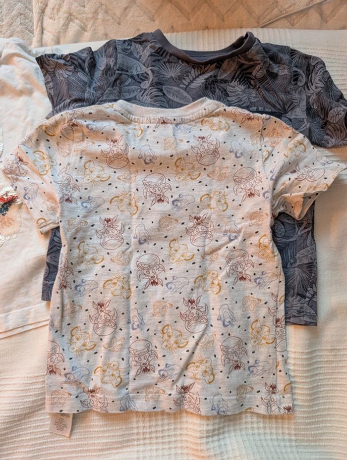 Lot composé de : - 2 t-shirts Vertbaudet 3 ans (dont 1 à sequins) - 2 t-shirts Primark 98 cm (dont 1 Disney avec dessins sur le thème du roi lion) - 1 t-shirt vynil fraise 3 ans rayé bleu clair