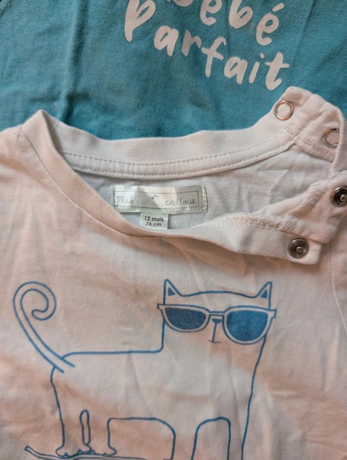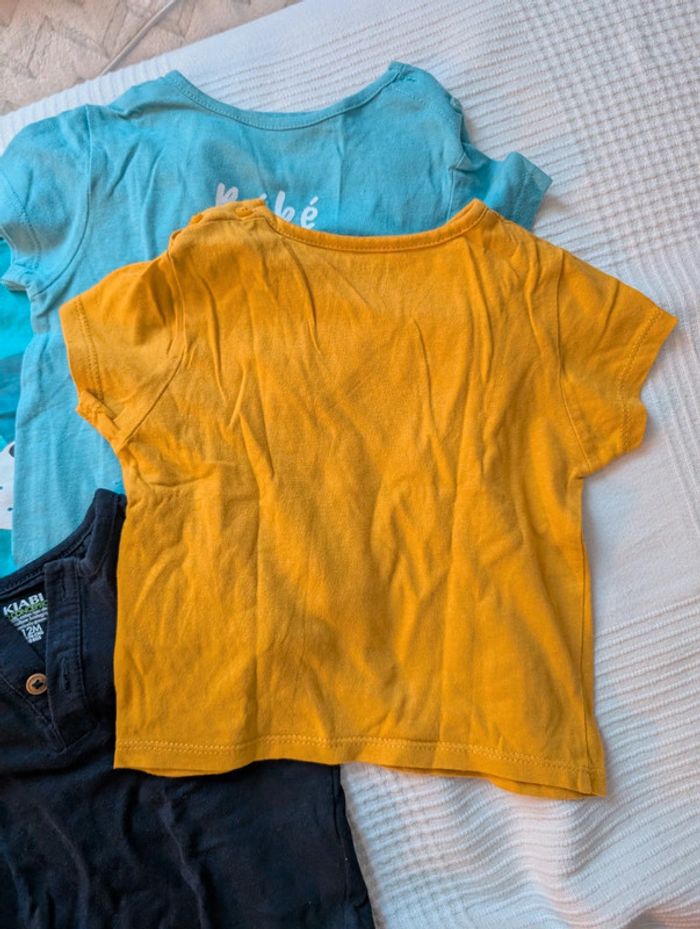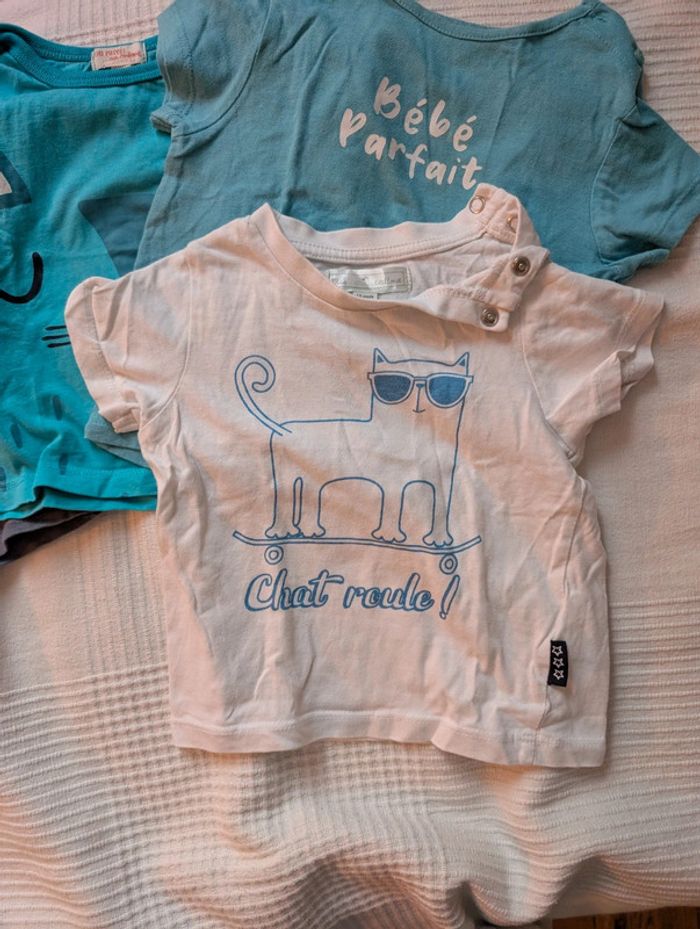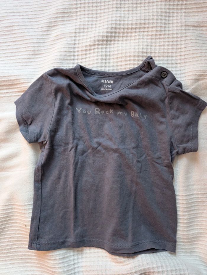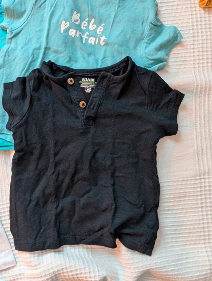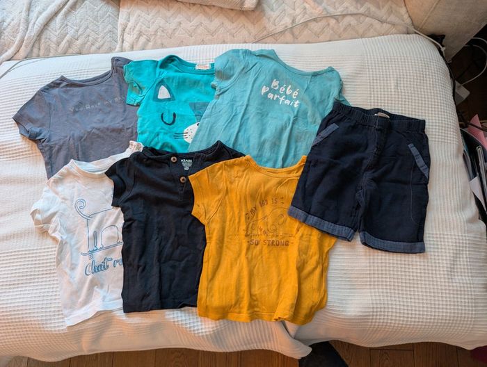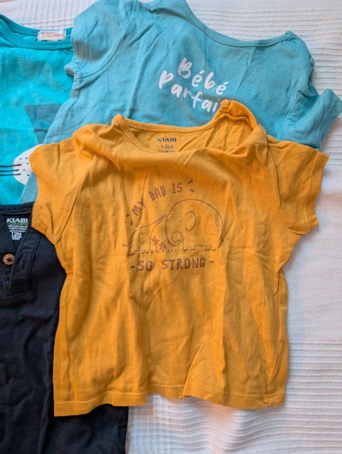 Lot composé de : - 4 t-shirts Kiabi - 1 t-shirt mes petits cailloux - 1 t-shirt dpam offert car un peu tâché - 1 short léger les bébés sont comme ça Le tout en 12 mois