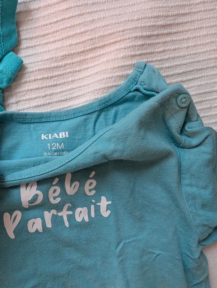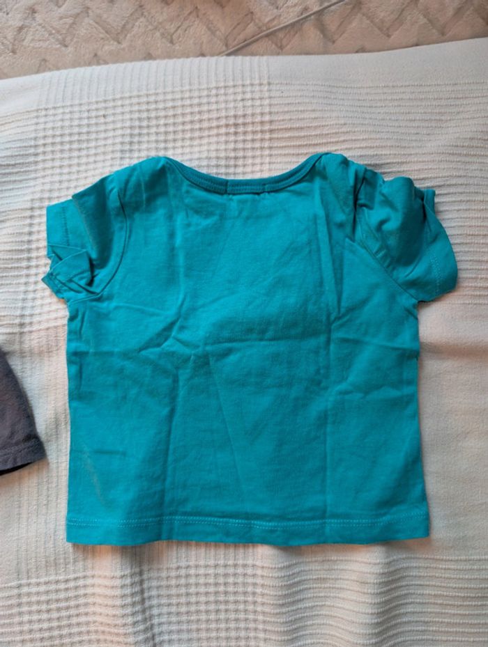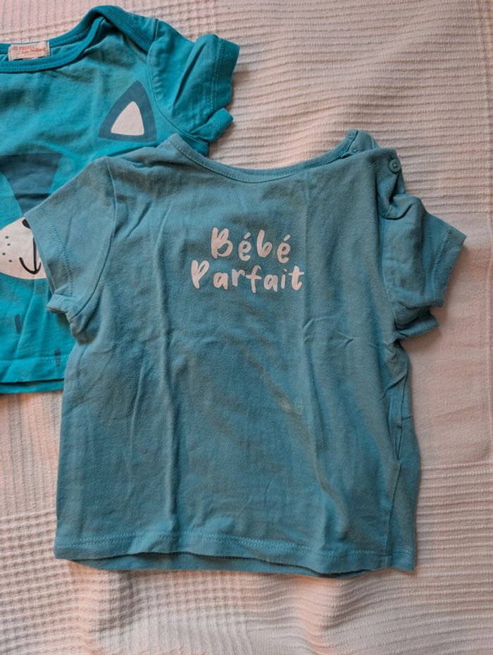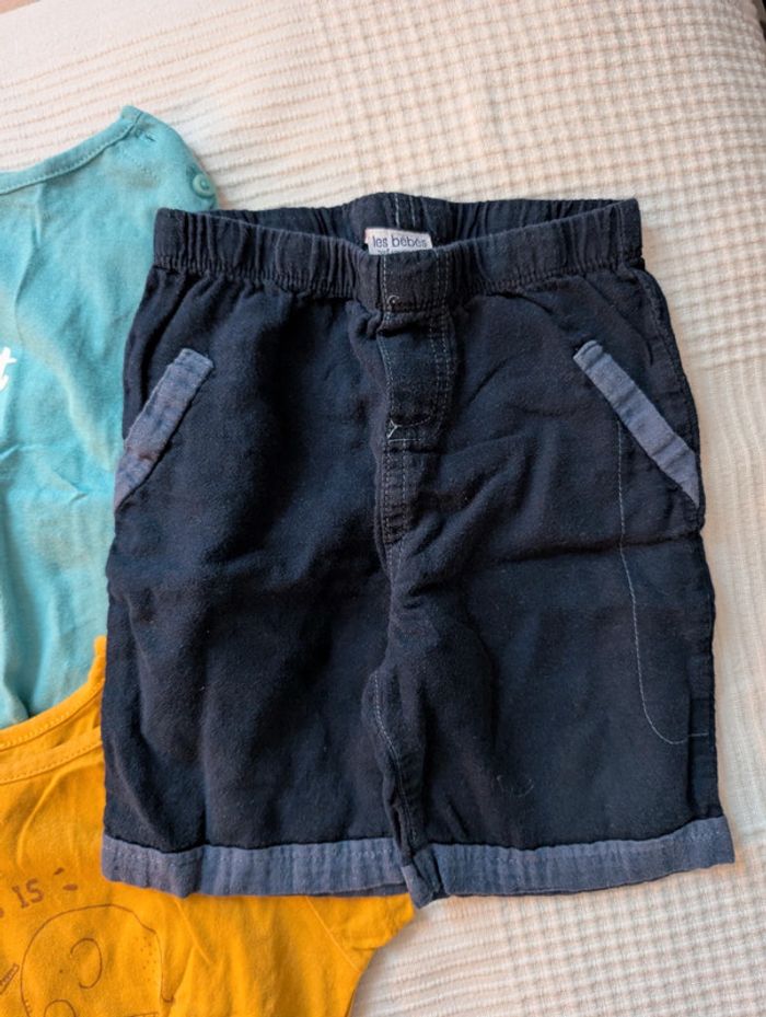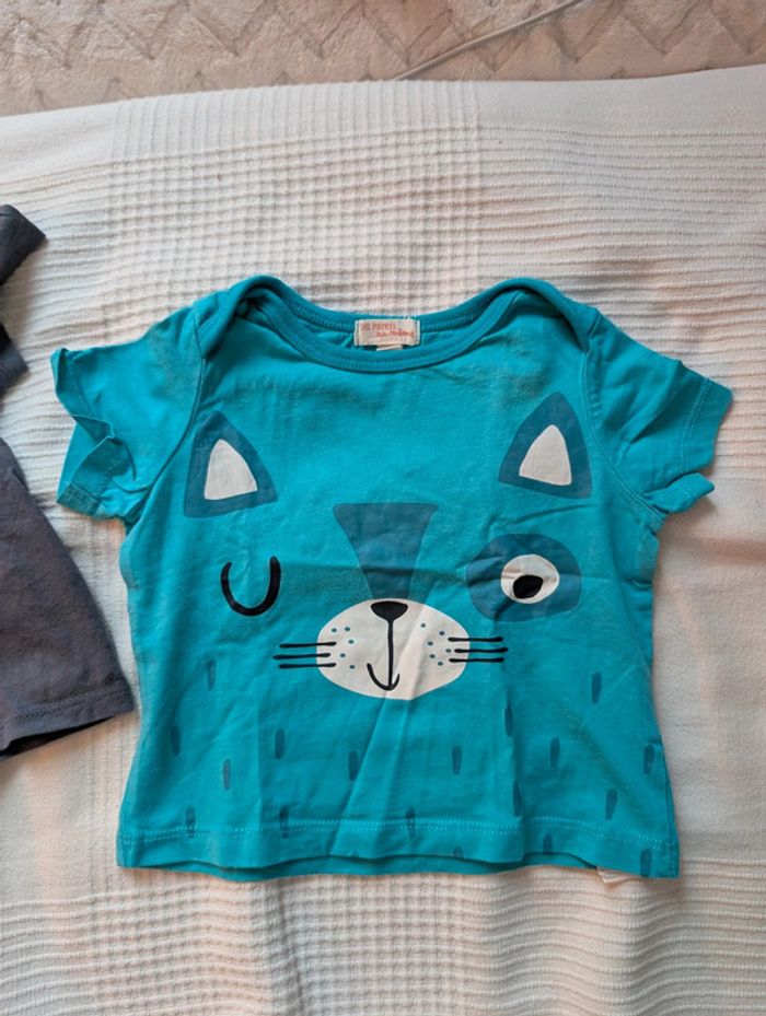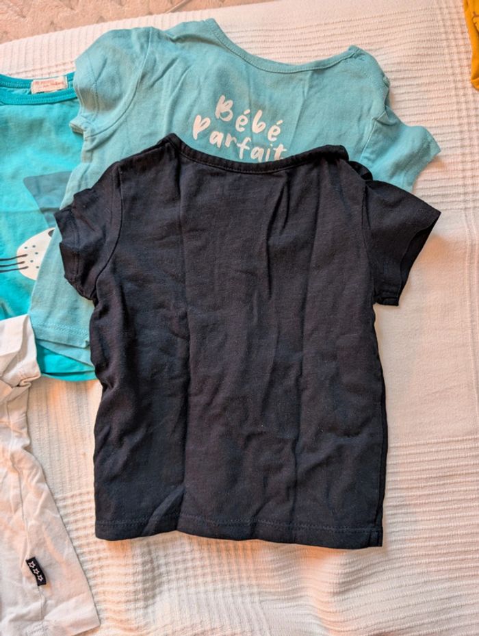 Lot composé de : - 4 t-shirts Kiabi - 1 t-shirt mes petits cailloux - 1 t-shirt dpam offert car un peu tâché - 1 short léger les bébés sont comme ça Le tout en 12 mois