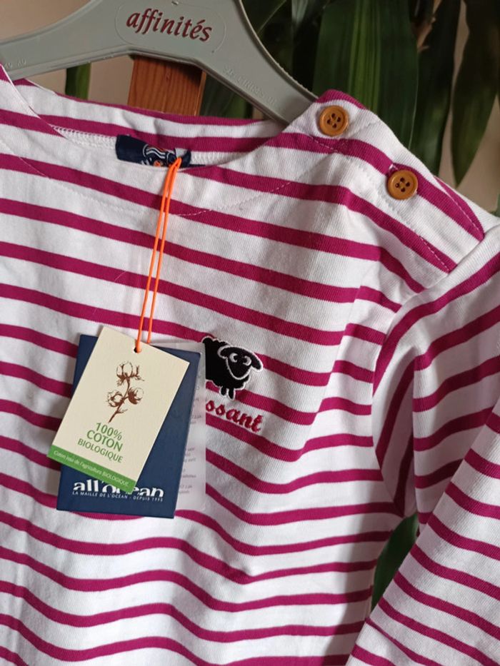 Marinière enfant All'Océan - Taille 8 ans Superbe marinière à manches longues de la marque All'Océan, en 100% coton biologique, idéale pour la mi-saison. Blanc à rayures bordeaux, avec boutons en bois sur l’épaule pour une touche authentique. Logo brodé sur la poitrine. Très bonne qualité, parfait pour un look marin chic et intemporel ! ✅ Taille : 8 ans ✅ État : neuf ✅ Envoi rapide et soigné