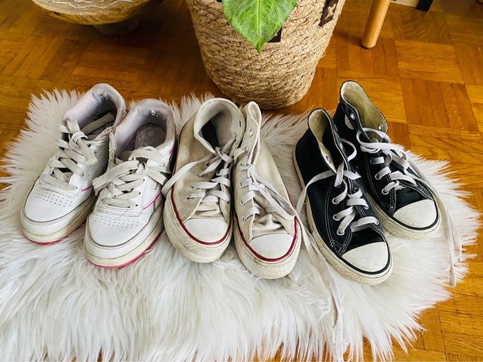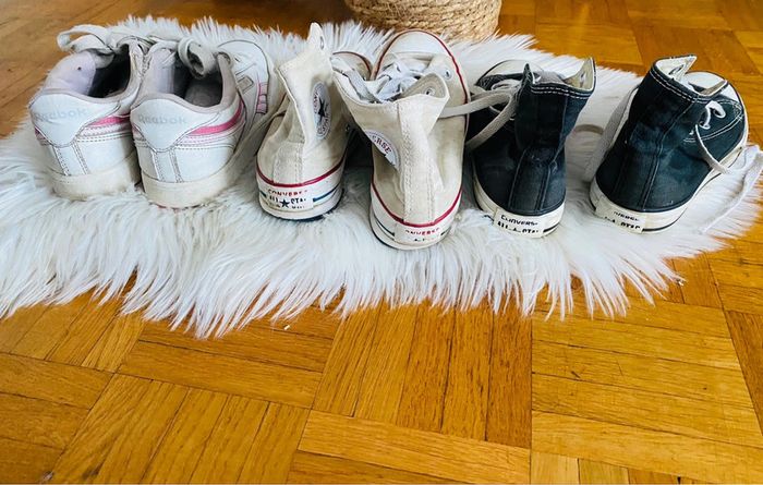Bonjour 🌺 Je vous propose : basket pointure 31 à 32,5 2 converse : 1 blanc pointure 31 satisfaisant, 1 noir pointure 32 bon état, 1 reebook 32,5 : satisfaisant merci 🌺🌺