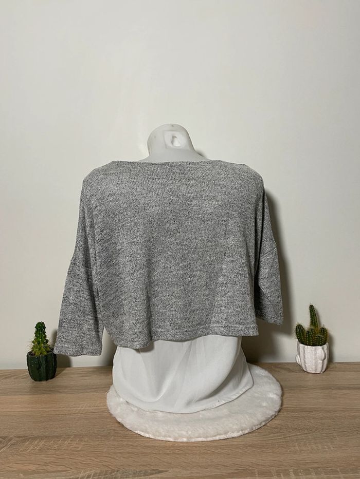 En parfait état 🌟 Débardeur fin blanc surmonté d'un top court gris plus épais et pailleté ✨ Idéale pour une tenue de fête 🍾 Les manches arrivent au niveau du coude 🫶🏼 Taille 0 sur l'étiquette, correspond à du M