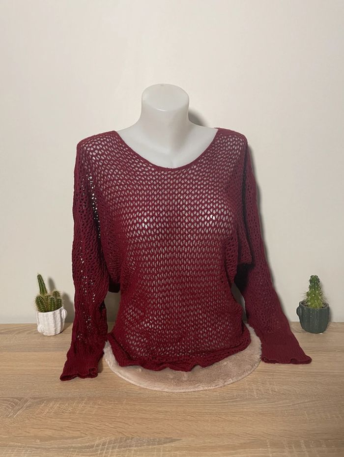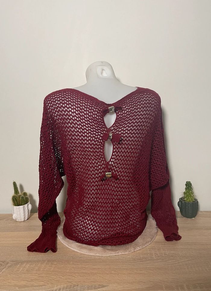Porté quelques fois mais en très bon état général 🌟 - Maille large aérée ⭐️ - Dos semi-nu avec noeuds décoratifs 🌺 - Manches chauve-souris 🦇 Il n'y a pas d'étiquette de taille mais correspond à du M/L