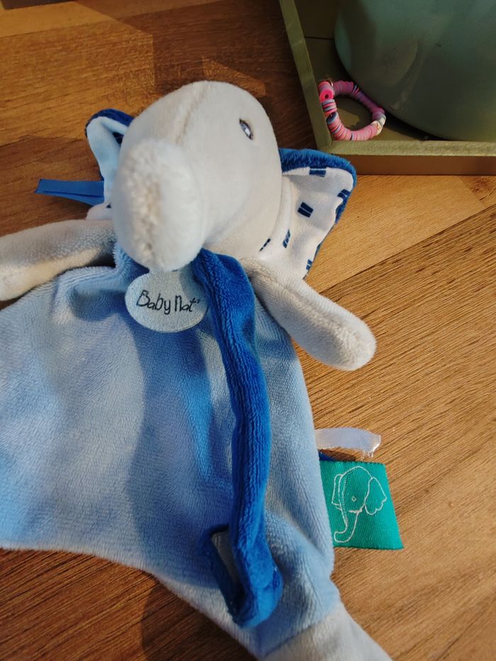 Doudou plat éléphant Edgar bleu gris attache tétine BABY NAT Excellent état Jamais. Utilisé en doudou Étiquette marque présente 9.90 euros envoi en relais