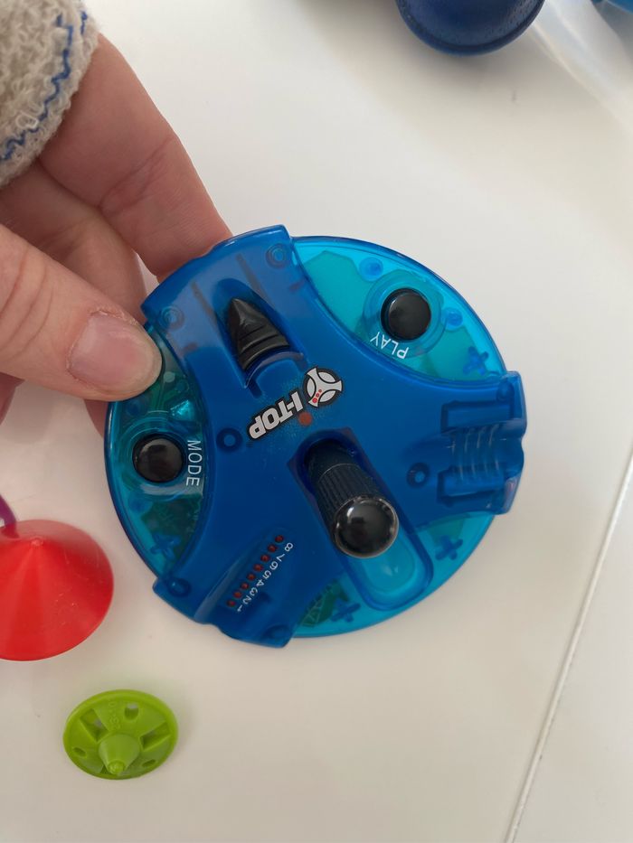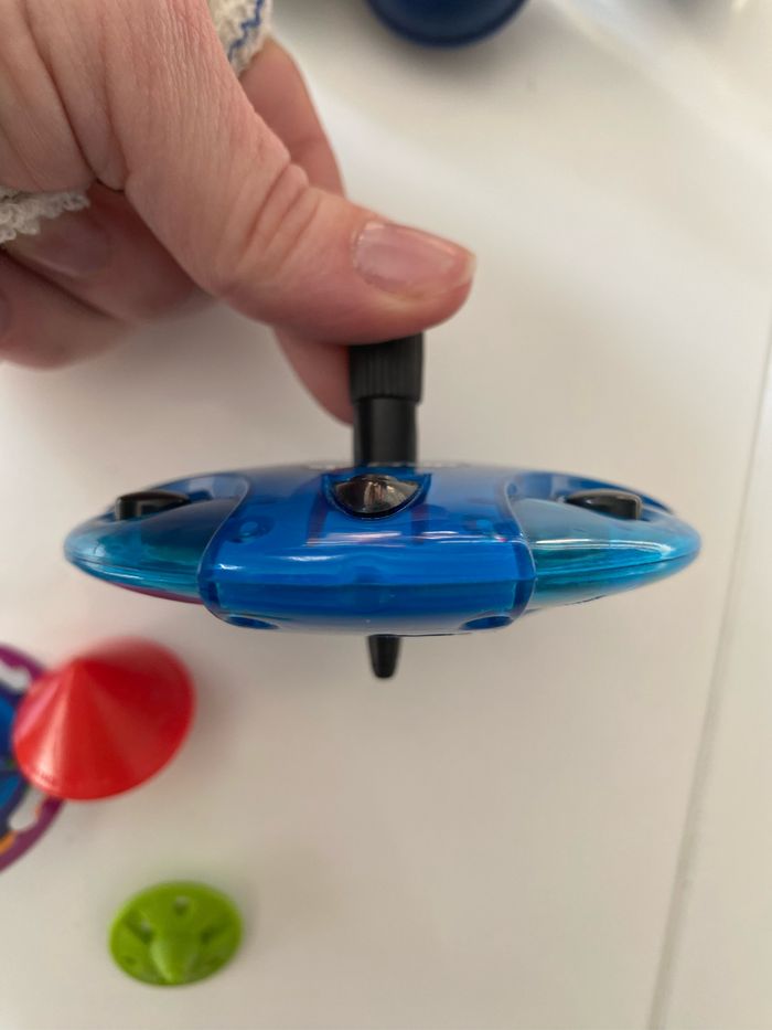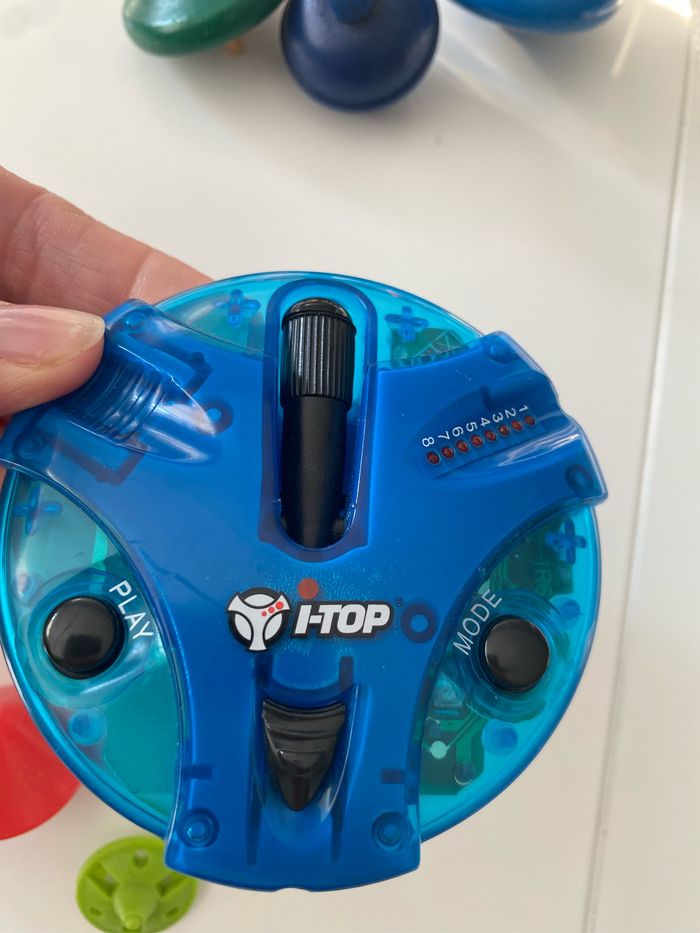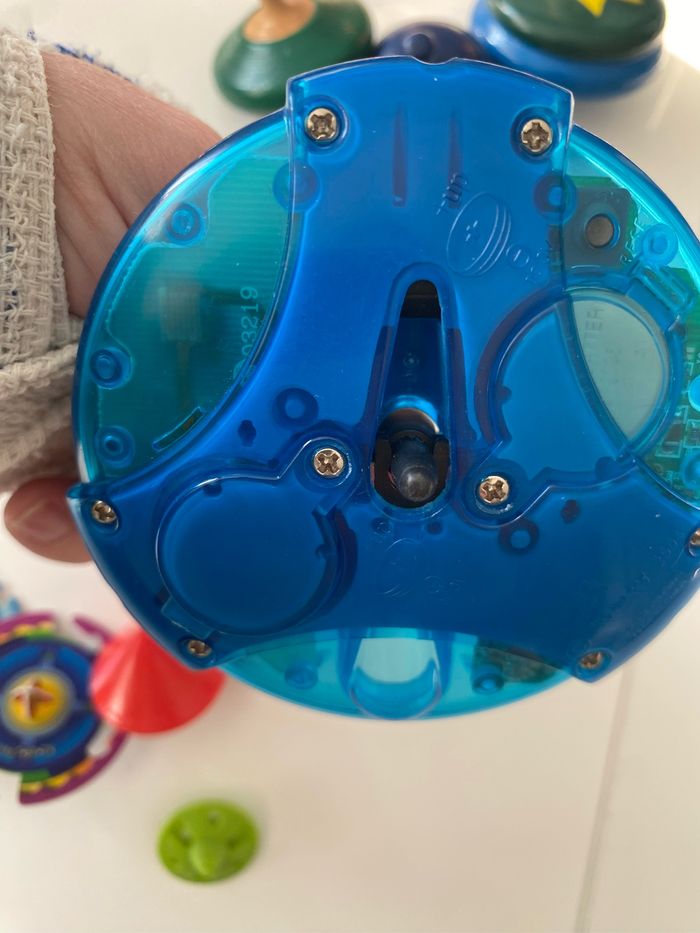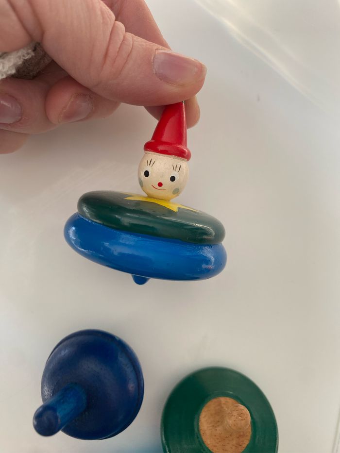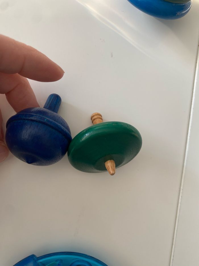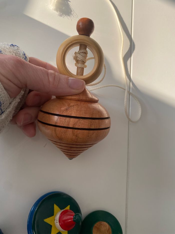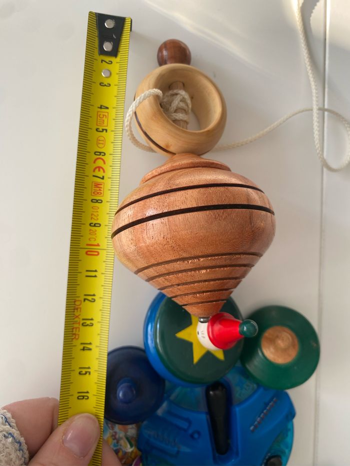 Lot de 9 toupies : pour celle à piles , il faudra en prévoir des neuves car sont HS , celles en bois sont neuves sauf la grosse qui a servi une ou deux fois ( je ne suis pas sûre d’avoir bien remis la ficelle donc à revoir aussi ) 15€