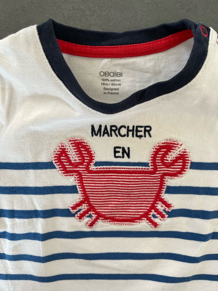 En très bon état. Maillot manches courtes Taille: 18 mois Marque: obaibi Maison non fumeur et personne soigneuse.