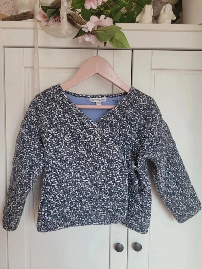 Veste matelassée en coton Taille 3 ans (ok jusque 4 ans) Marque verbaudet Coloris marine avec petites fleurs liberty Pas de défaut Très peu porté et proche du neuf Pas de négociations prix d'achat assez élevé (proche du neuf prénom indiqué)