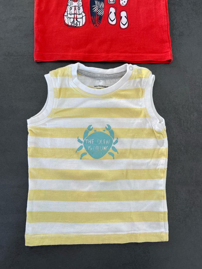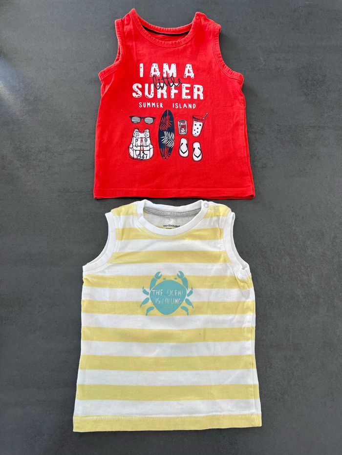 En très bon état. (juste une mini trace derrière le rouge voir photo.) Lot de 2 Maillots sans manches Taille: 18 mois Marque: vertbaudet et gémo Maison non fumeur et personne soigneuse.